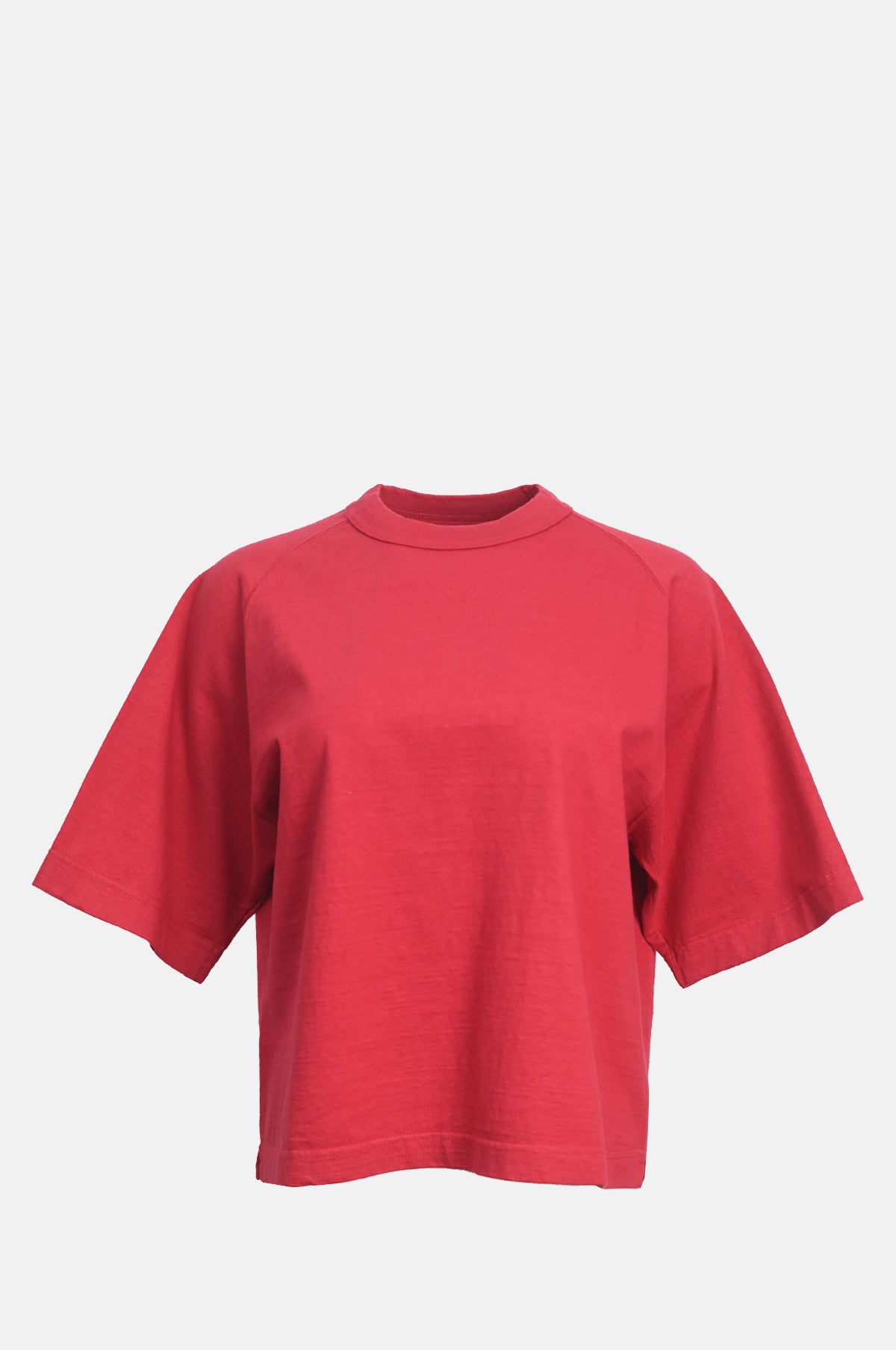 A cut above your standard t-shirting fare, the red Mahuna short sleeve t-shirt from Sunray will be a hardworking staple in your wardrobe. Cut from a heavyweight cotton jersey, it has a cropped and boxy silhouette with raglan sleeves and small side slits at the hem. Produced using special Japanese Ochiwata recycled cotton offering a t-shirt that is wonderfully soft, luxurious and durable. Also available in navy and off white.