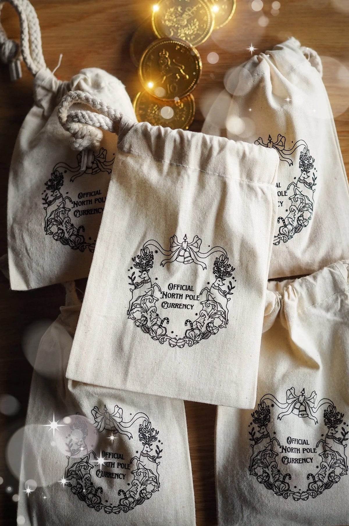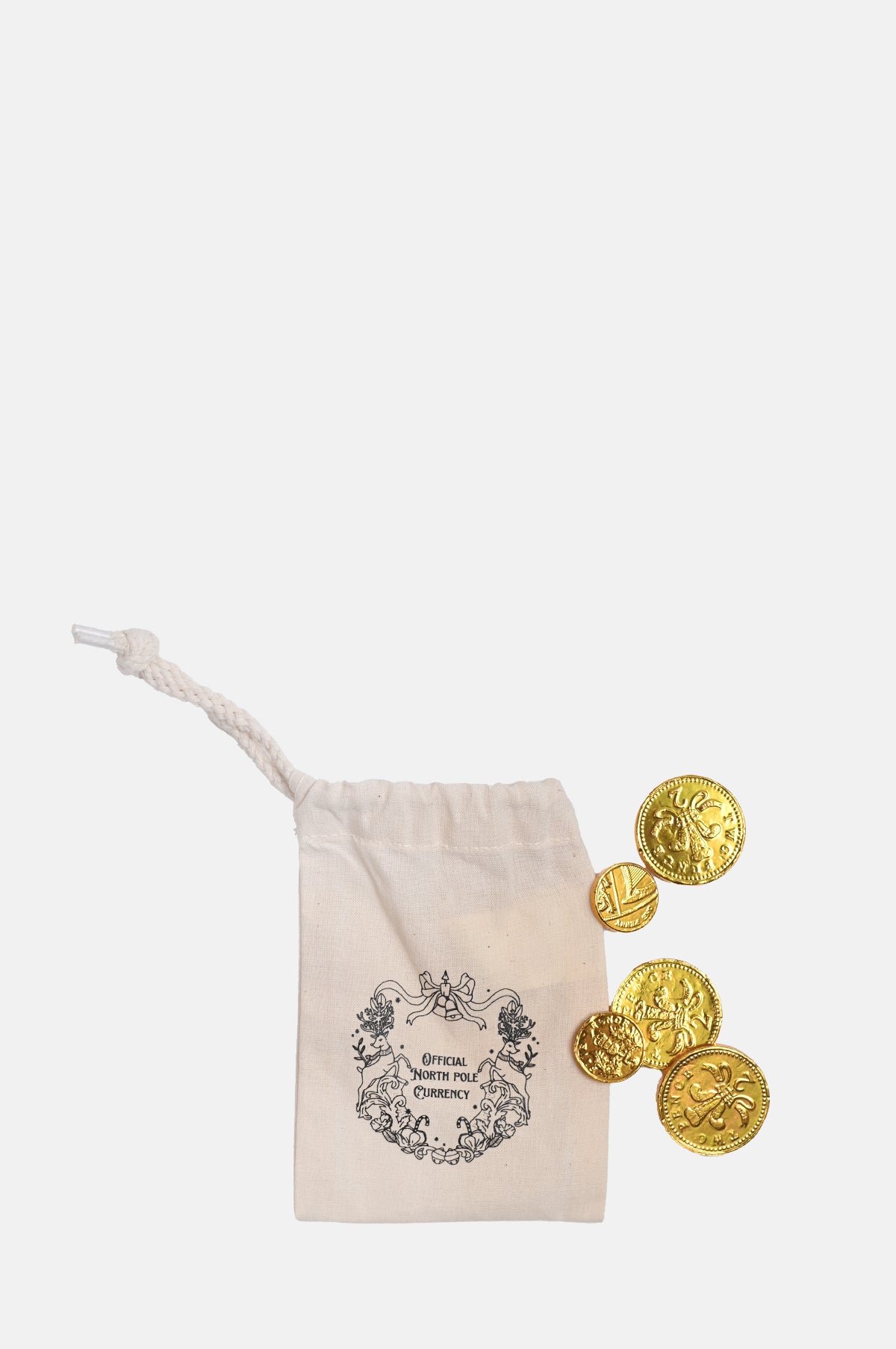 Chocolate is the best currency of them all and this adorable drawstring cotton pouch contains five 'North Pole' chocolate coins. A perfect gift for stuffing stockings with.
