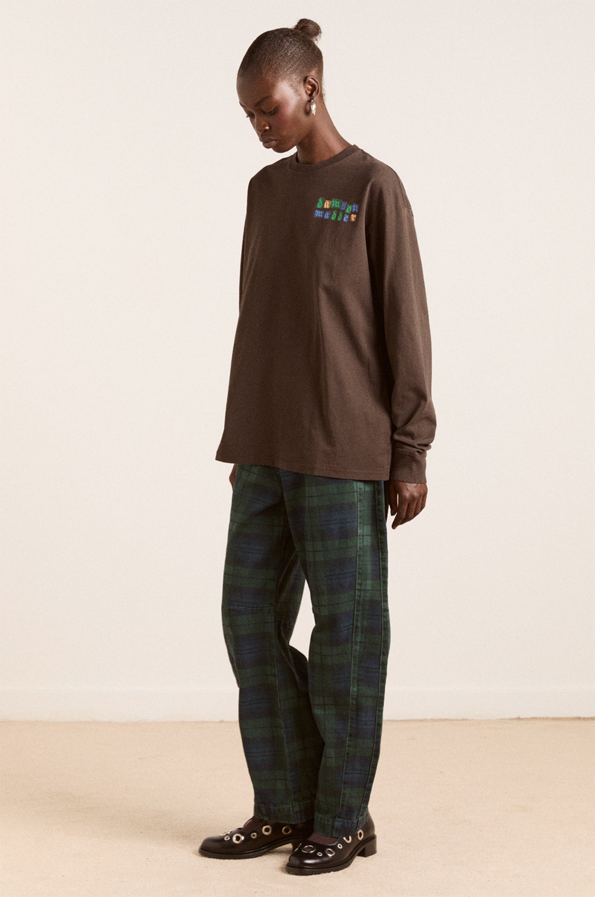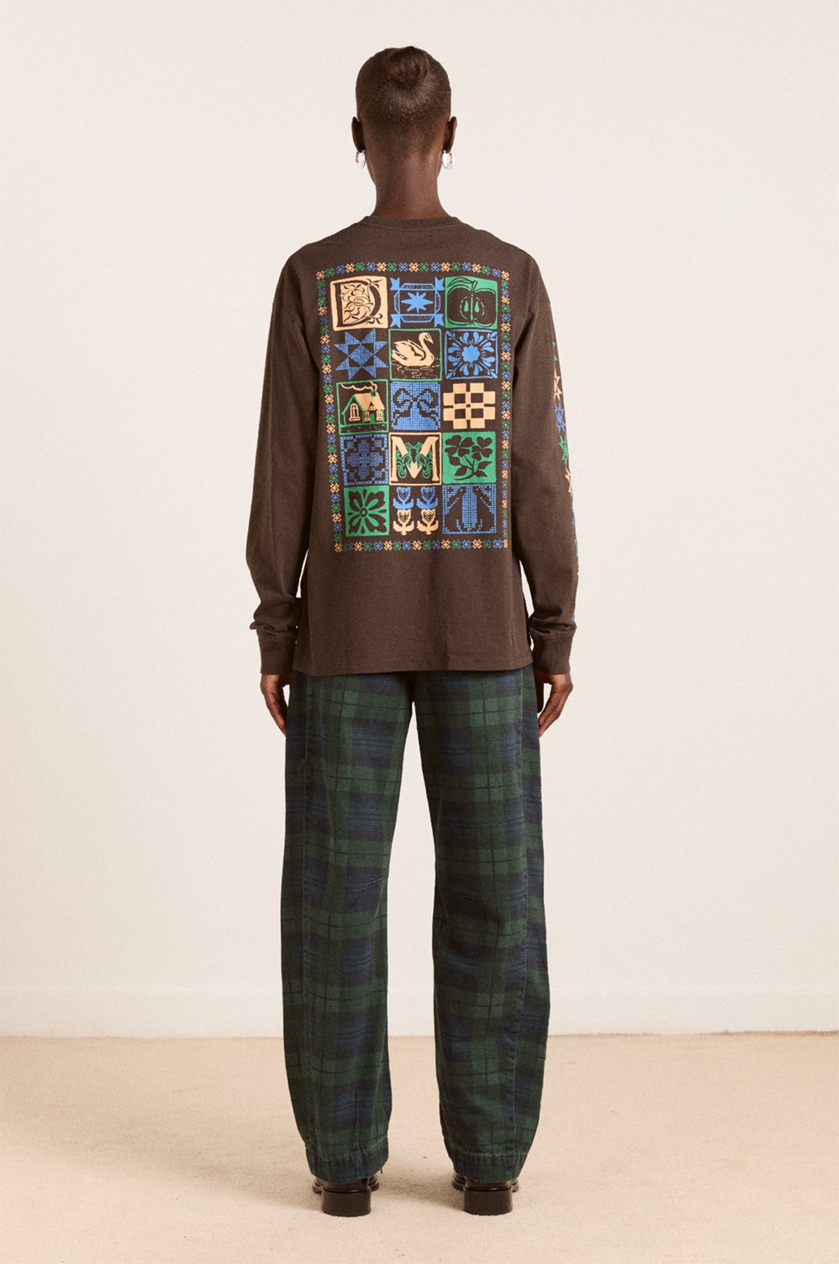 The perfect addition to a casual outfit, this Damson Madder t-shirt offers endless versatility and comfort. Designed for a relaxed, oversized fit and woven from a super soft lightweight cotton, this brown long sleeve t-shirt features playful graphic prints which run along the arms. A large graphic stars at the back of the t-shirt, depicting a sweet patchwork scene of a house, flora, fruit and animals.