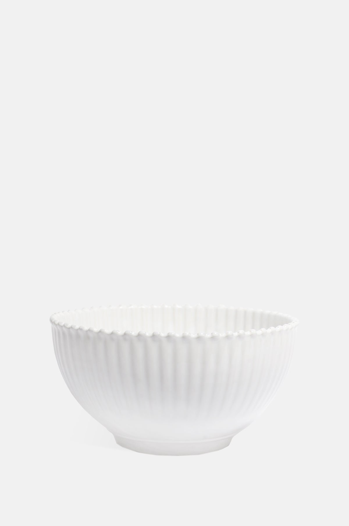 This Pearl White Centerpiece serving bowl with pearl edging and ribbed detailing will look beautiful in the middle of your dinner table and it's perfect for both fancy and everyday use. This one is in our smaller size. The Pearl collection was inspired by XVIII and XIX centuries European ceramics.