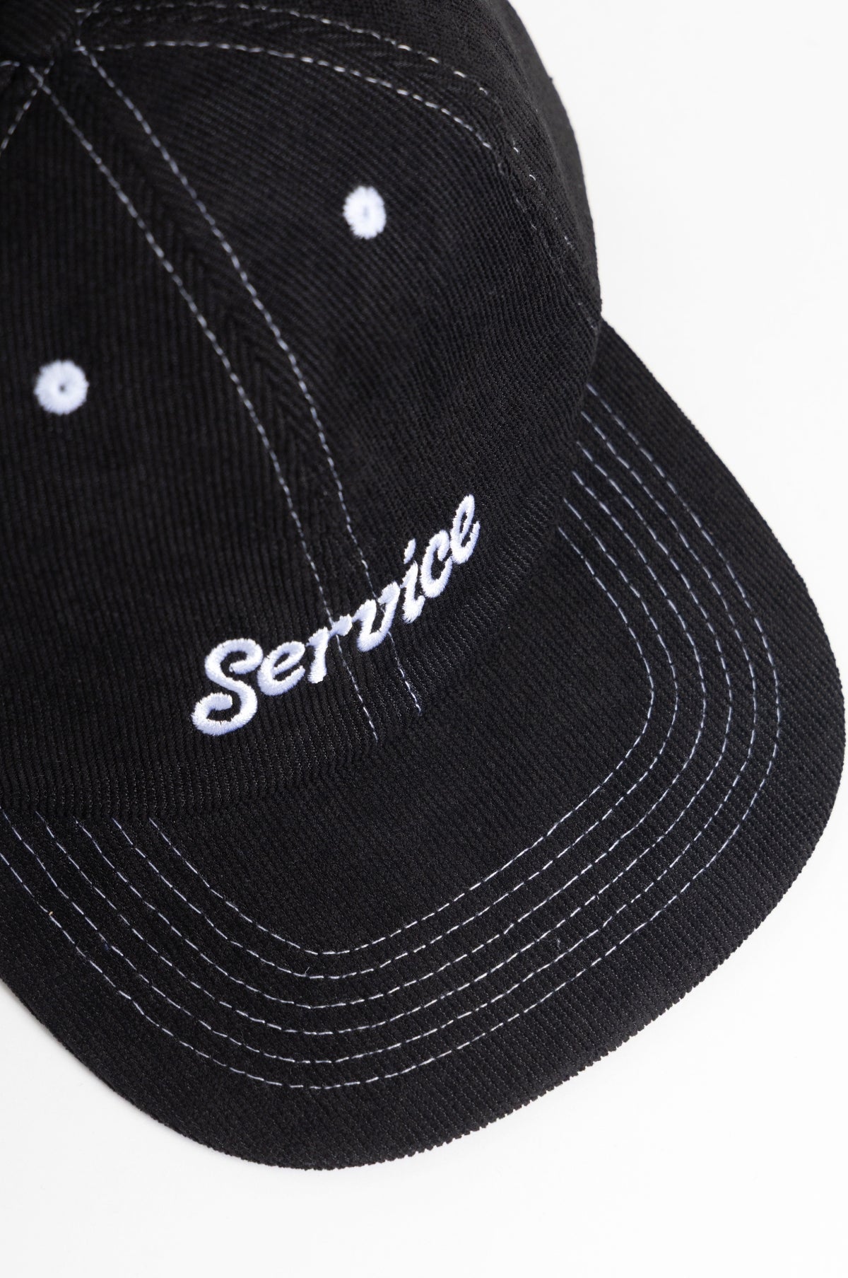 The Service Script Cap is a classic corduroy six panel camp hat with a low profile fit. This black version features an embroidered script logo in white at the front and has a concealable nylon webbed strap for the perfect custom fit.