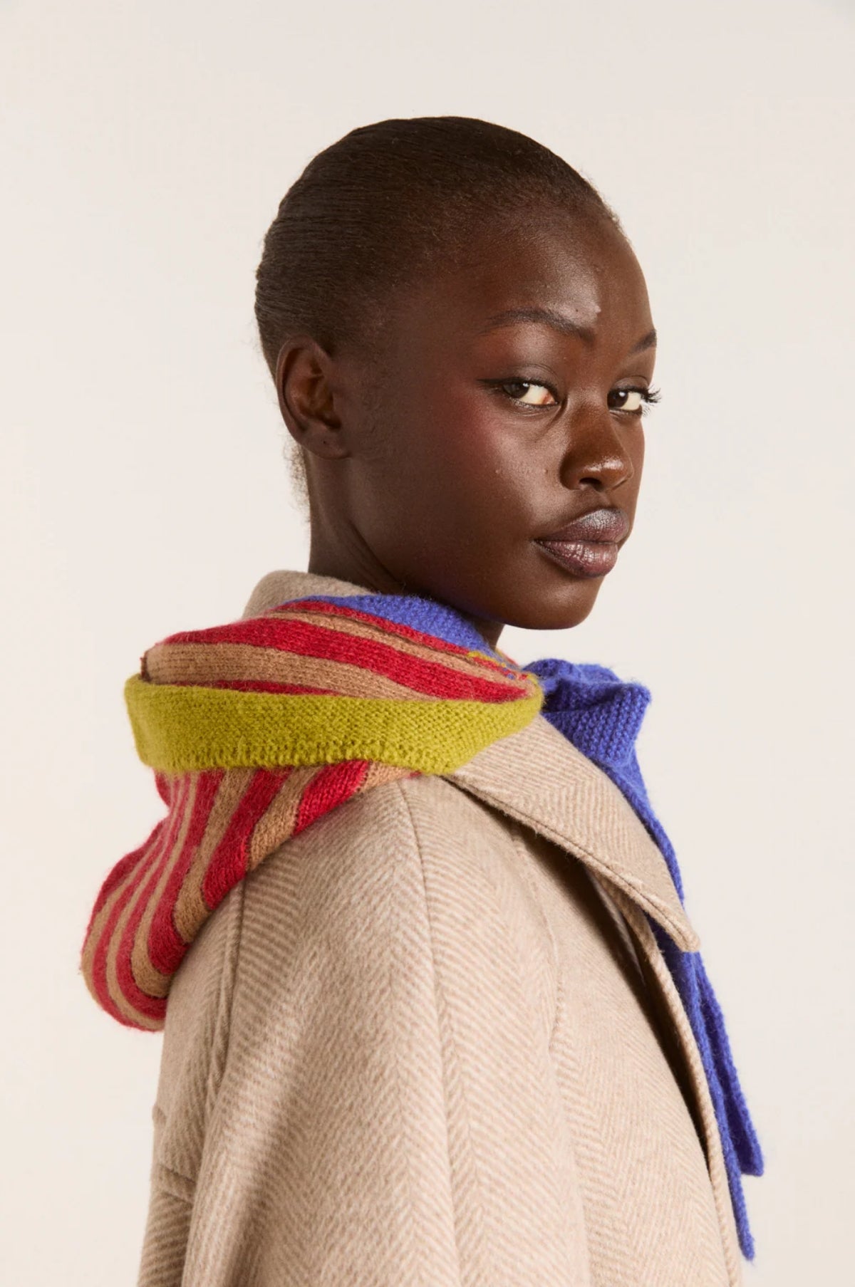 Injecting a cheering burst of colour into our winter wardrobes, this colour block knit bonnet is playful in its design and pattern. Thoughtfully made with a mixed stripe pattern and contrasting neck ties.