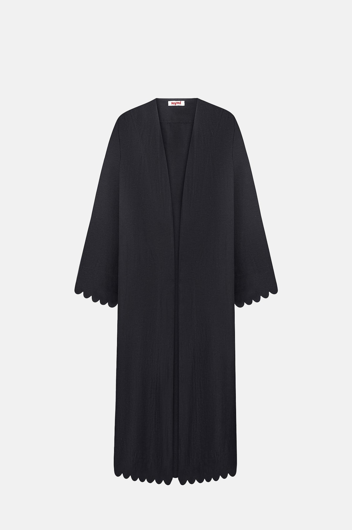 Made from a breathable linen blend, this black kimono from Nyni is a luxurious layer for cooler days and perfect for transitional dressing. Scallop detailing on the cuffs and hem add an elegant touch and make it versatile enough for lounging in or to layer up with as part of your outdoor wear.