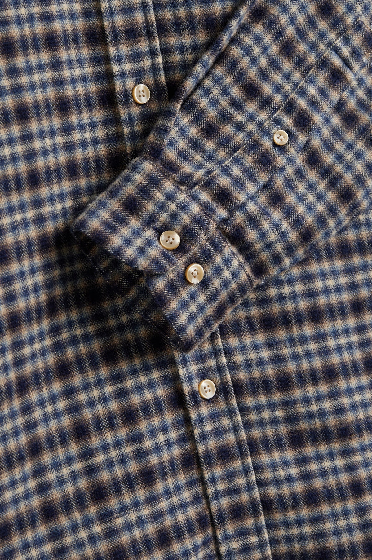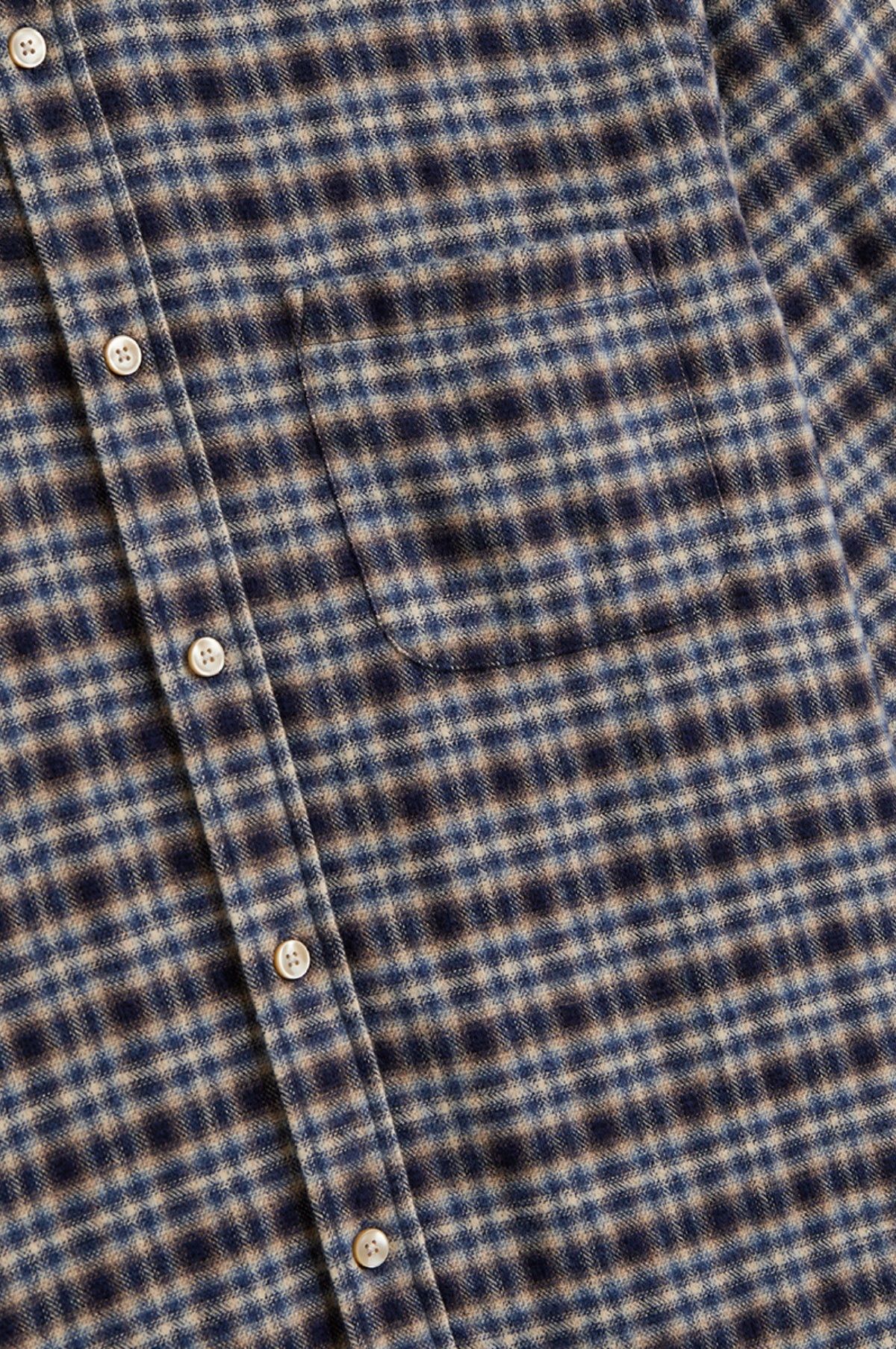 The Vouga Shirt from Portuguese Flannel is constructed of a super soft brushed cotton making it great for the cooler months, finished with a simple chest pocket, Autumnal plaid and regular collar making it incredibly versatile whether you choose to dress it up or down. The plaid pattern is made up of shades of blue, brown and beige.