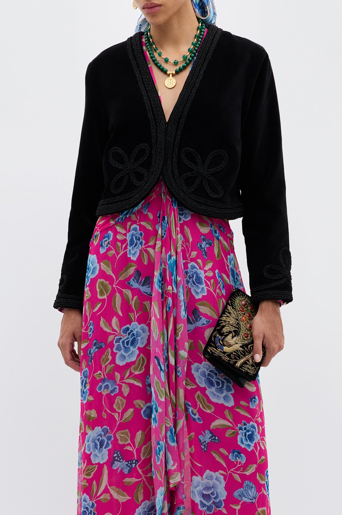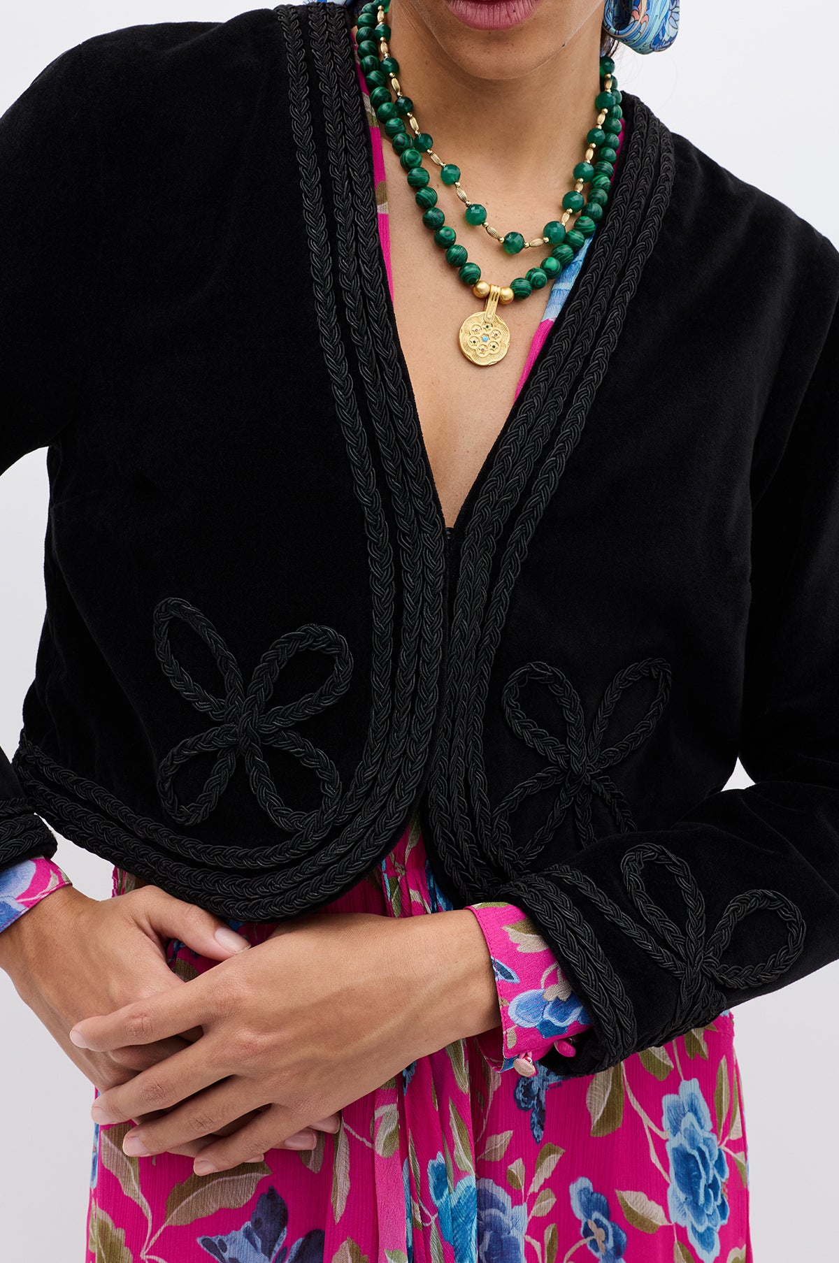 Rixo are the masters of vintage-inspired treasures. The Kesia jacket is their latest venture in the world of outerwear and it is a beauty. A perfect pairing for many an outfit - this black velvet jacket is cropped at the waist and features intricate braided soutache detailing.
