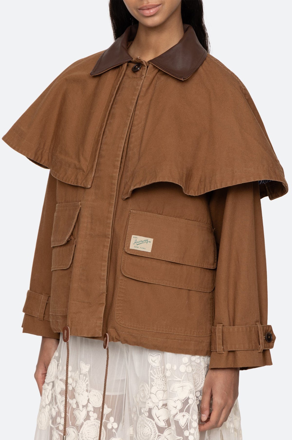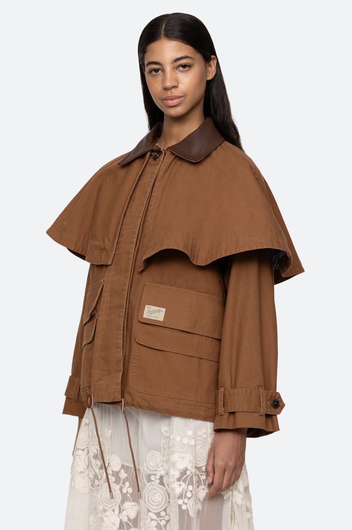 They say the devil works hard, but we think Sea, New York works harder. Their attention to detail is truly unmatched. Take this camel-coloured cape jacket, for example: its stunning architectural shape feels distinctly Holmesian, while evoking the rustic charm, practicality and ruggedness of the American outdoors. Luxurious touches - like the leather collar, blue -and-white striped lining, utilitarian flap pockets, custom 'Sea' label, and adjustable drawstrings at the hem- only add to its appeal.  With its oversized, relaxed fit, it's perfect for layering over long skirts and duck boots.