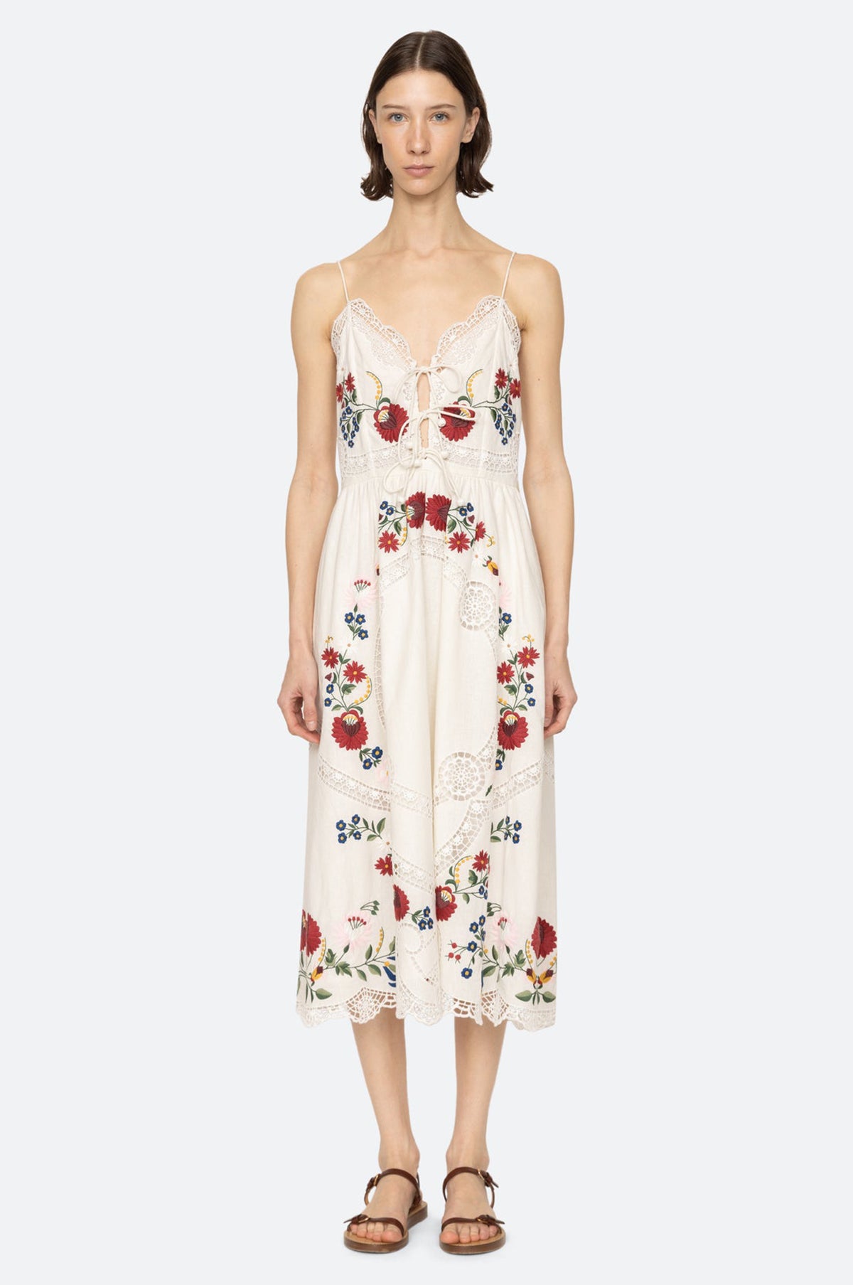 A romantic, vintage-inspired cream slip dress from Sea, New York featuring delicate floral embroidery, lace accents, and front tie closures, the Celia dress blends effortless elegance with intricate detailing. It has a graceful midi-length silhouette that makes it a breeze to dress up or down.