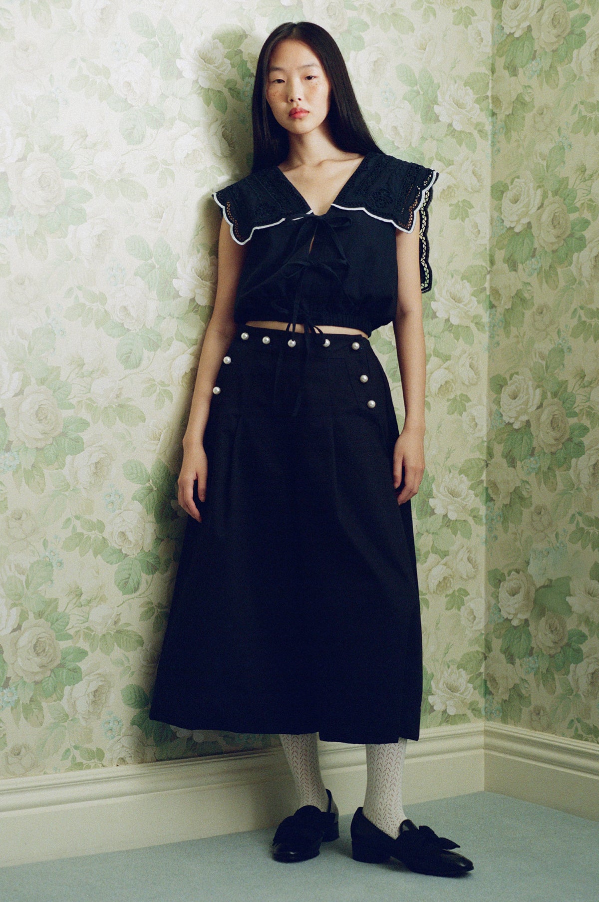 Ahoy There! Featuring a sophisticated fusion of nautical charm and contemporary design these navy culottes from Sea, New York will inject a bit of maritime influence into your wardrobe. Cropped with a flare leg, they feature pearl button accents and pleated detailing adding a touch of elegance to their wide-leg silhouette. The flattering high waist and shorter length also make these fun to style and offers a great play on proportions. Lean into the nostalgic feel of these trousers by pairing with lace socks, loafers, and a relaxed, tie front blouse.
