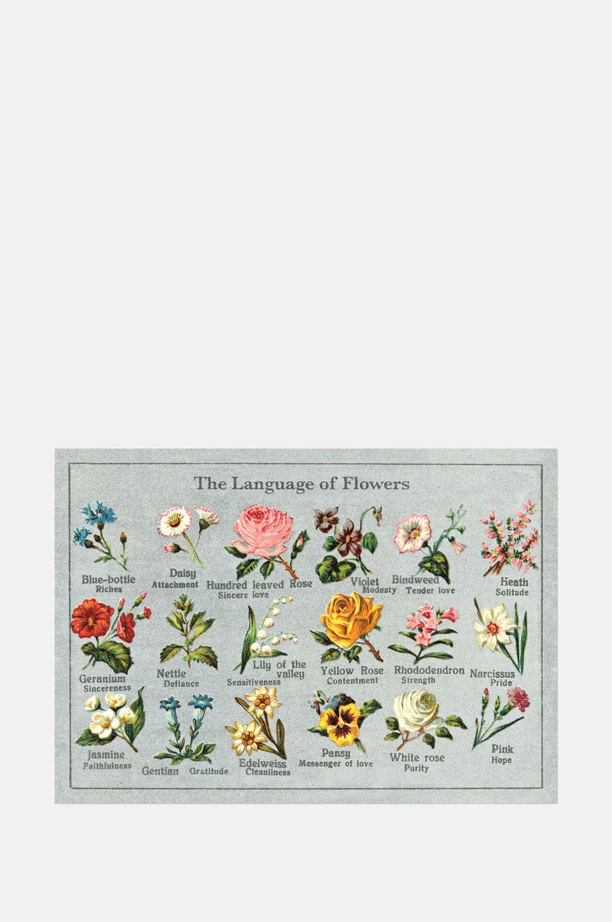 Some cards can't help but bring you joy and this greeting card illustrating flowers and their associated emotions has a charming poignancy that will be loved by all and for many occasions. Adapted from an Edwardian postcard illustrating 18 different flowers and their symbolic meaning it celebrates the idea that a flower could represent a particular sentiment, which was popular in Victorian times.