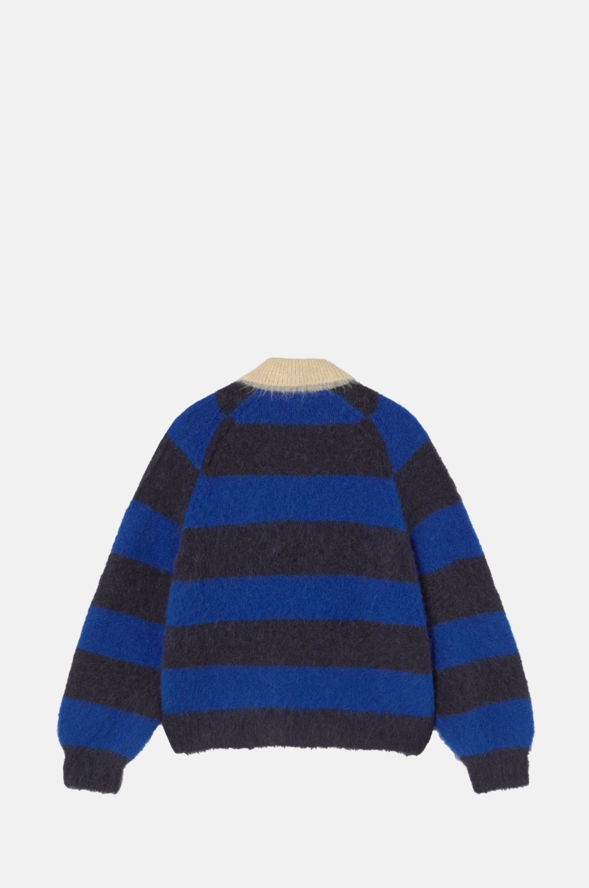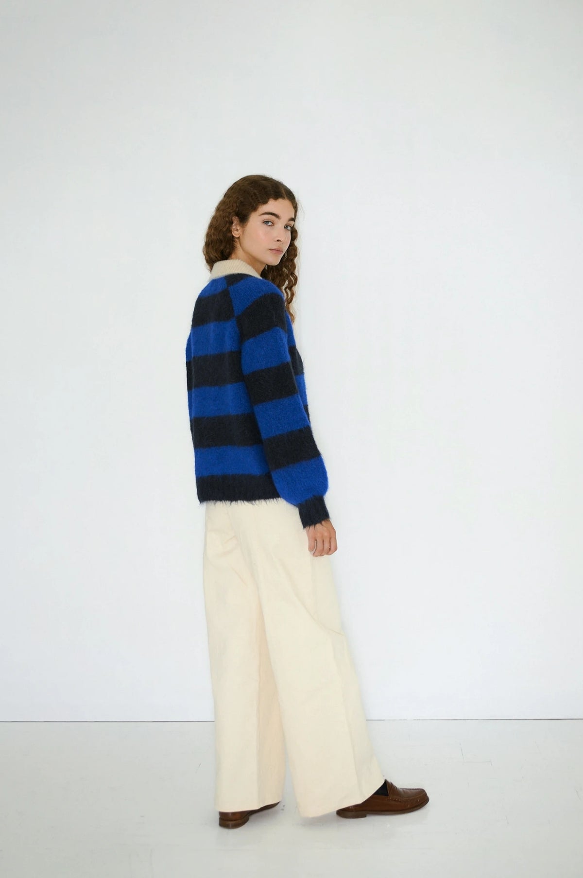 A modern take on a classic silhouette. Knitted with oversized stripes in ultramarine and navy, this polo sweater features a contrasting oatmeal collar and placket for a refined, preppy look. Finished with ribbed hems and fully fashioned details for a structured fit. Snuggle us up in this straight away please!