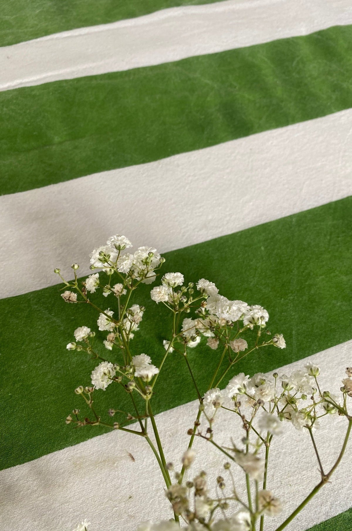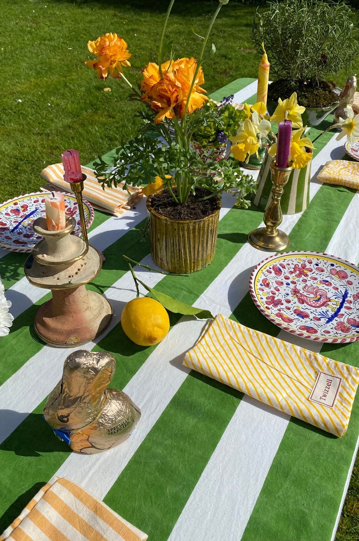 Its amazing how a well designed table cloth sets the perfect backdrop for any table display. New to the shop we love this striped collection from British brand Twizell. Crafted in Jaipur using a traditional block printing technique, this Kelly green striped table cloth has a classic wide striped design. Perfect for large gatherings and long tables, this jubilant tablecloth will add a bit of cheer to any Spring or Summer tablescape.