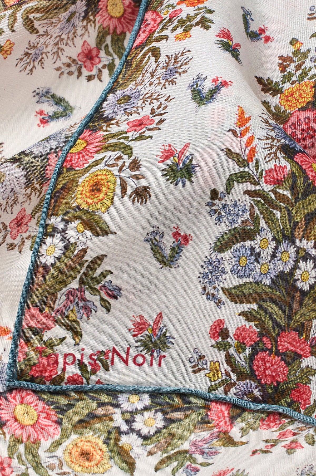 This small square, beautifully soft, cotton and silk peach scarf features a floral print from their antique fabric archives that originated in France from the early 1800's. The edges have been rolled and sewn by hand - a time-intensive process that gives the scarf a very handsome hem.