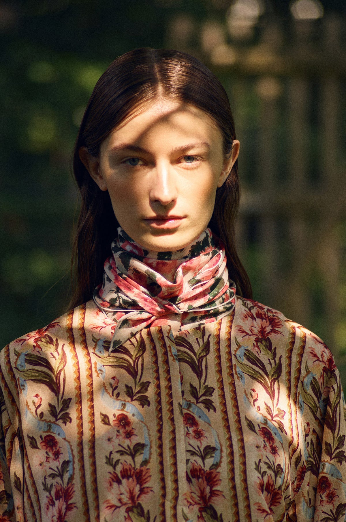 - Small cotton and silk scarf with an all-over green and pink floral print on an off-white background