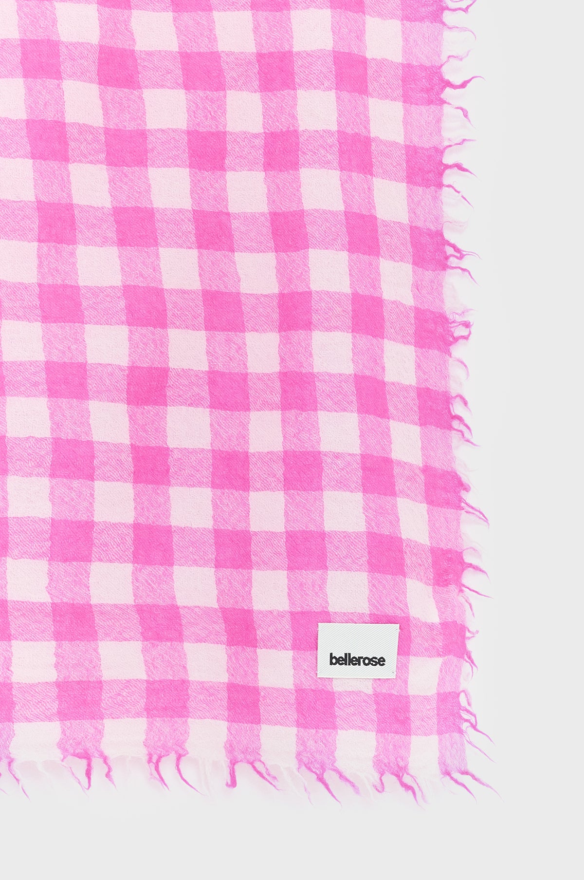 Adding a splash of colour to the day's proceedings, this Bellerose scarf put a spring in our step. Voluminous yet lightweight, it is patterned in pink and white checkered wool and finished with soft fringed edges.