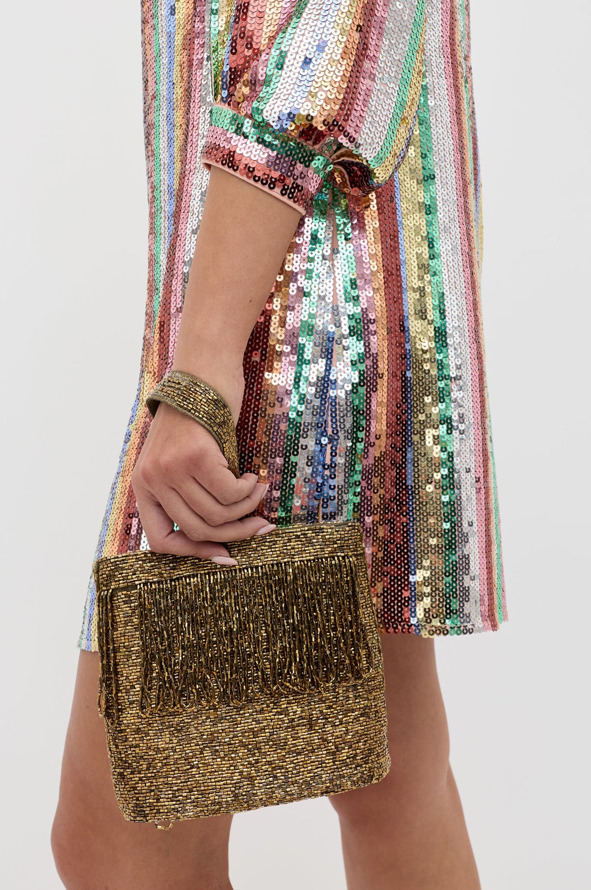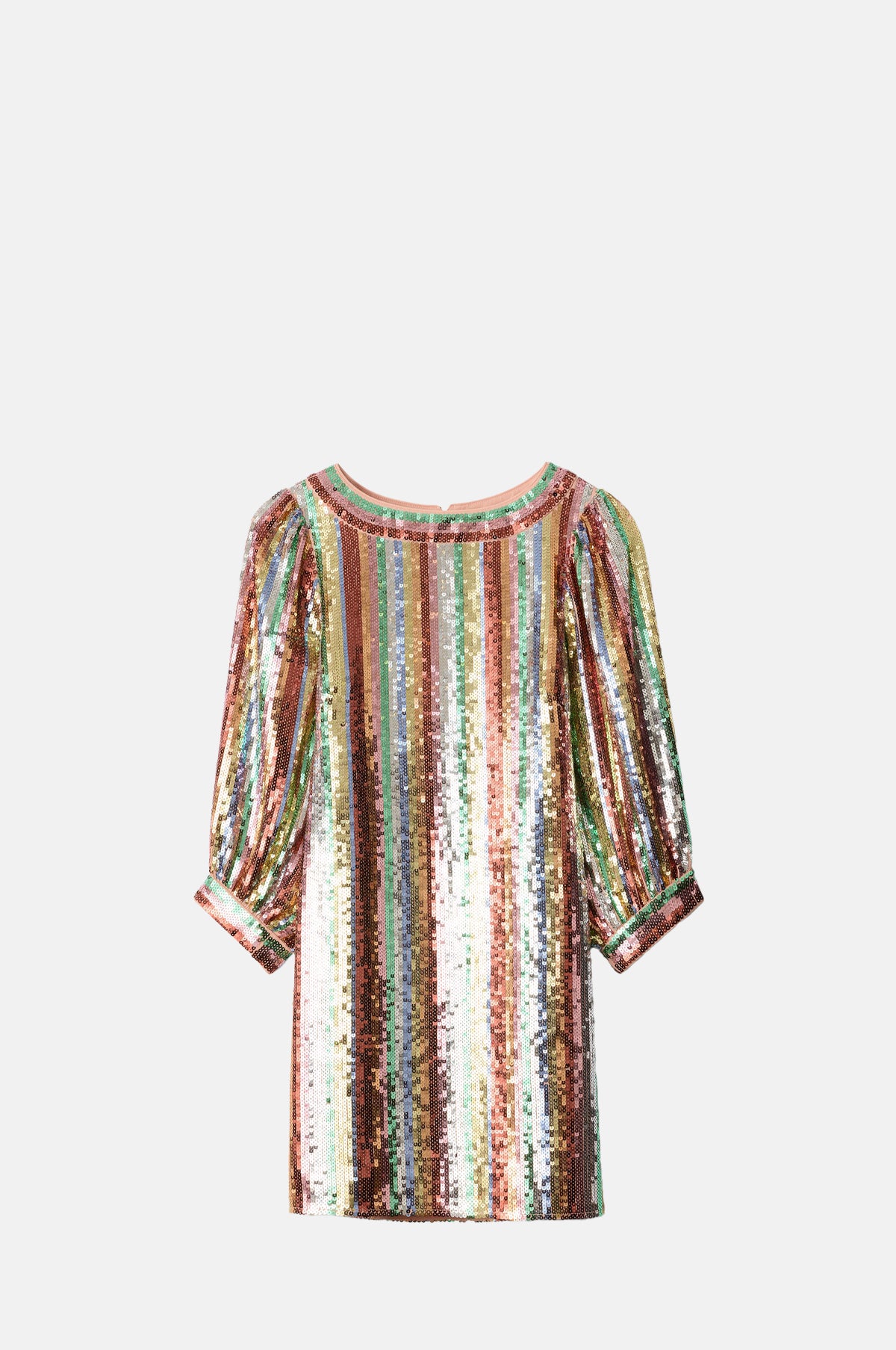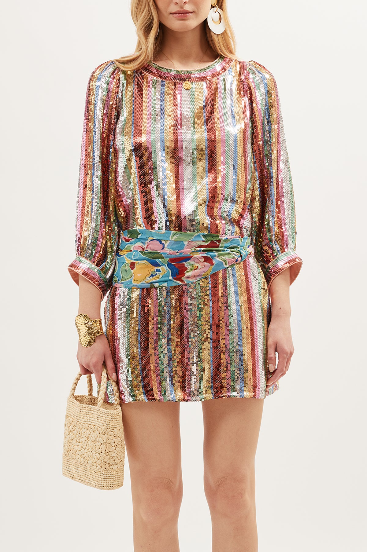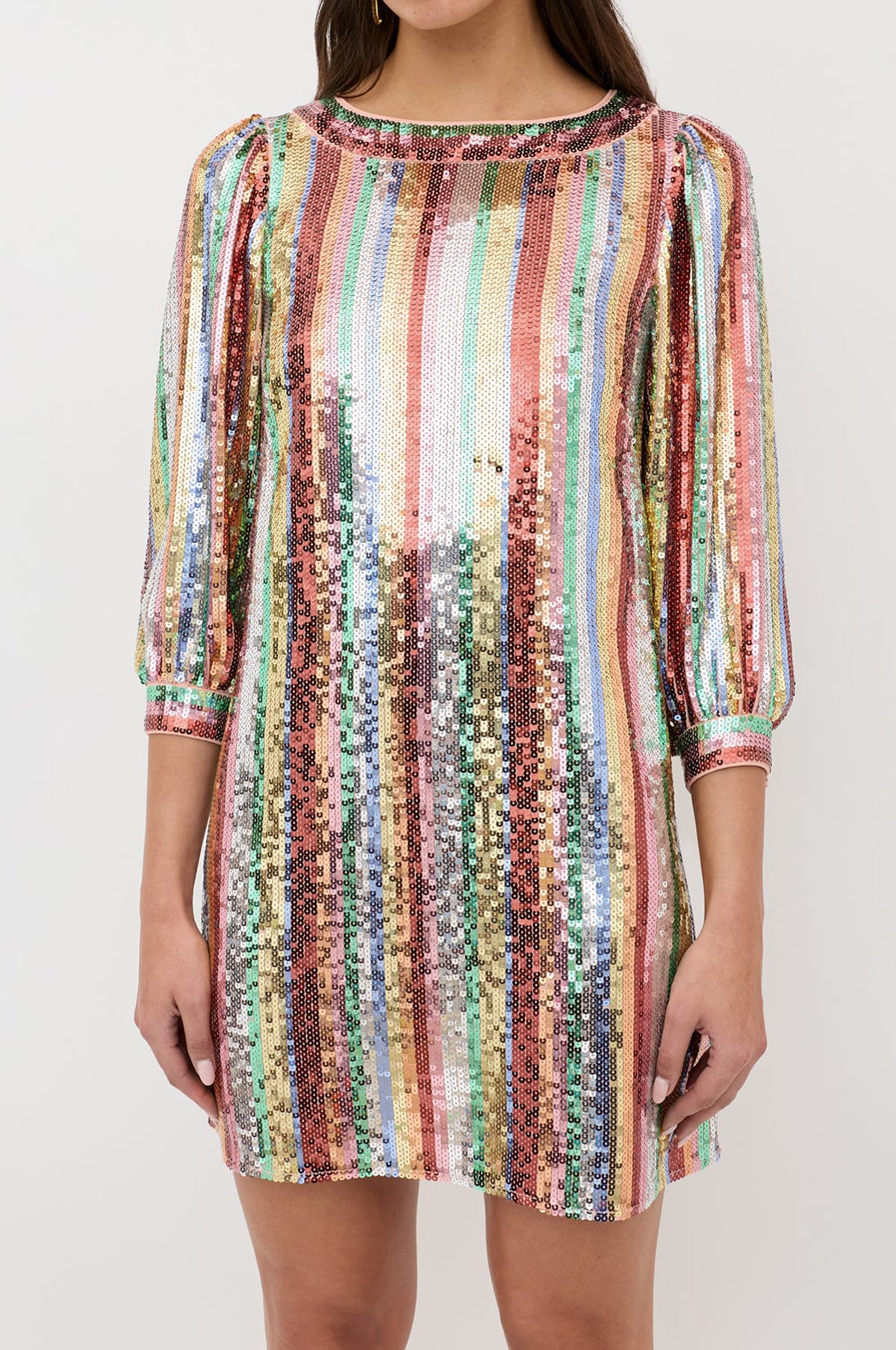 This dress is deserving of a party to be thrown in its honour! Embellished from top to bottom in rainbow striped sequins, the Laurie Dress is the ultimate party mini. Romantic bishop sleeves frame the dress and a wide, round neckline completes the design. It is a beautifully flattering piece to see you through the party season.