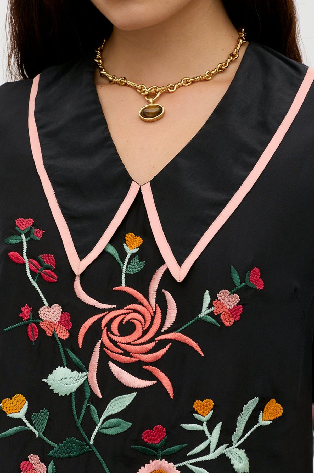 Vintage-inspired, the Nicolina blouse from Rixo has a romantic sensibility that makes it utterly charming. Spun from silk, this black blouse has a relaxed, boxy fit with subtle slits at the side which provide a beautifully flattering silhouette. At the centre of the top lies an assortment of floral embroidery in soft hues of pinks, yellows and greens which are echoed with a blush pink trim which runs around the collar, hem and sleeves. Perfect for pairing with a slip skirt.