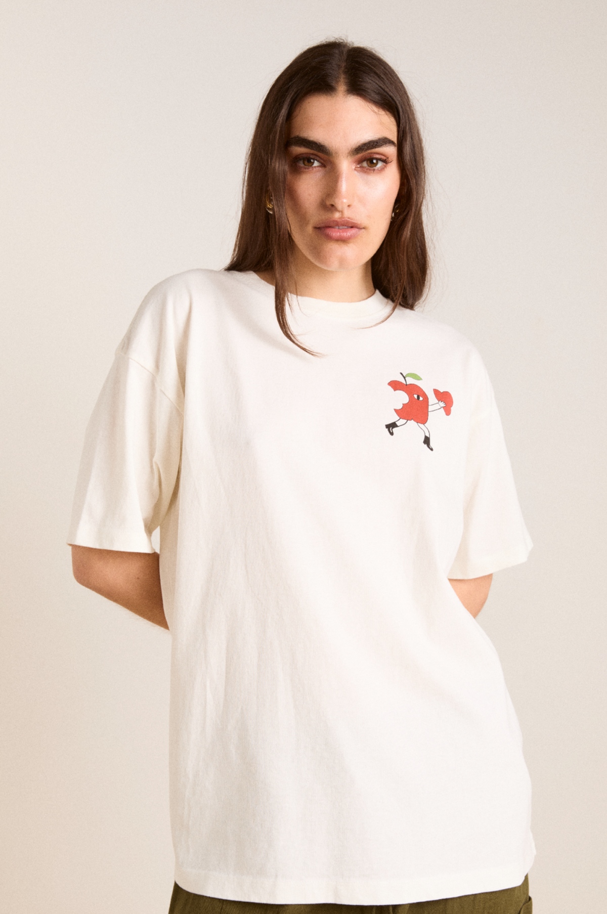 An oversized white t-shirt from Damson Madder with playful apple graphics - this is a great top for relaxed days. Crafted from a wonderfully soft cotton jersey, it features a crew neck, drop shoulders, and short sleeves. Pair with comfortable shorts and your favourite trainers.