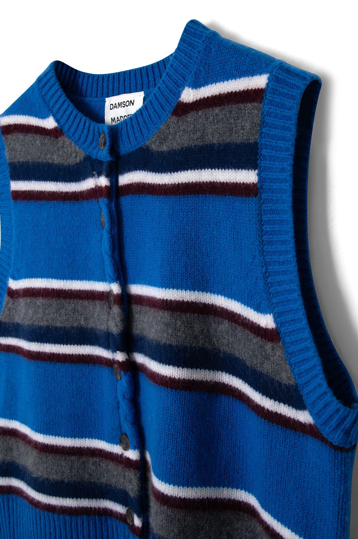 The Sofie Vest brings an elevated ease to everyday layering and makes transitional dressing a joy. Patterned in a white, red, blue and grey stripe that rests against a bright blue base, this knit is crafted from a medium weight wool. A cable-knit button placket, ribbed trims and branded tortoiseshell buttons add subtle texture and detail to the vest. For casual comfort pair with a long sleeve tee and denim.