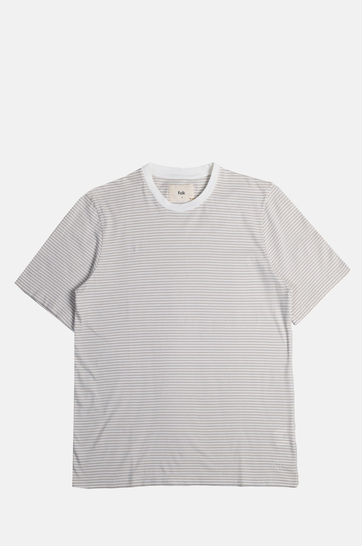 Folk offers style without drama using simple patterns with a focus on quality and textures to create approachable collections enriched by subtle details. The 1x1 Stripe Tee is a wardrobe staple with its fine stripe design in shades of stone and slightly relaxed fit making it easy to wear on its own or layered under a jacket.