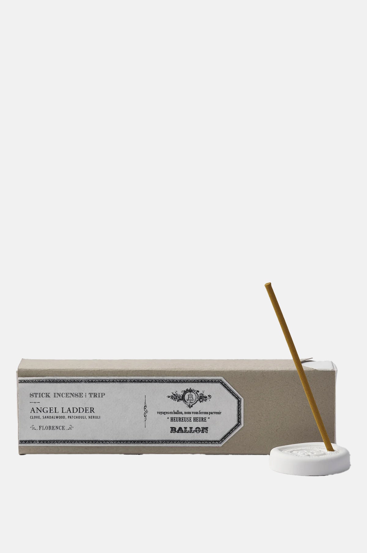 Step into the golden light of Florence with Angel Ladder, a beautifully crafted incense set by Japanese brand Ballon. Part of a collection inspired by four iconic cities, this refined box includes 20 incense sticks and a porcelain stand, designed for both elegance and ease. The fragrance is a luminous composition of clove, sandalwood, patchouli, and neroli — warm, resinous notes lifted by bright citrus florals. A scent that feels timeless yet radiant, like beams of sunlight breaking through Tuscan skies. A moment of quiet luxury, perfect for elevating everyday rituals.