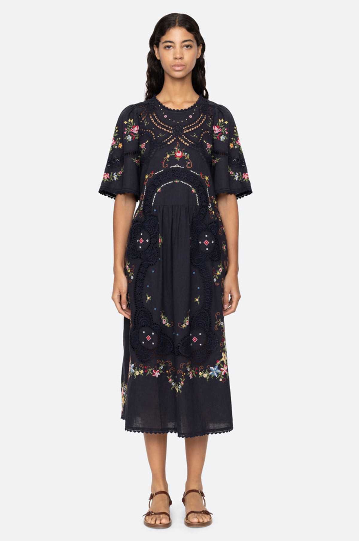 Known for their distinctive use of lace and embroidery the Edwina Dress encapsulates what Sea New York does best. A midi-length navy dress with cross-stitch embroidery and open lacework it manages to be both vintage and modern with its contemporary take on Victorian needlework. Additional details like short floaty sleeves trimmed in scalloped lace, a feminine tie-back, and lace trimmed hem will keep you looking ethereal and angelic. Made from a substantial blend of cotton and linen it also feels wonderfully cool and will keep you serene in temperate weather. We can't wait to wear ours whilst relaxing on a picnic blanket as we feel the gentle heat of the sun on our skin while the smell of sweet strawberries and a soft breeze float past.