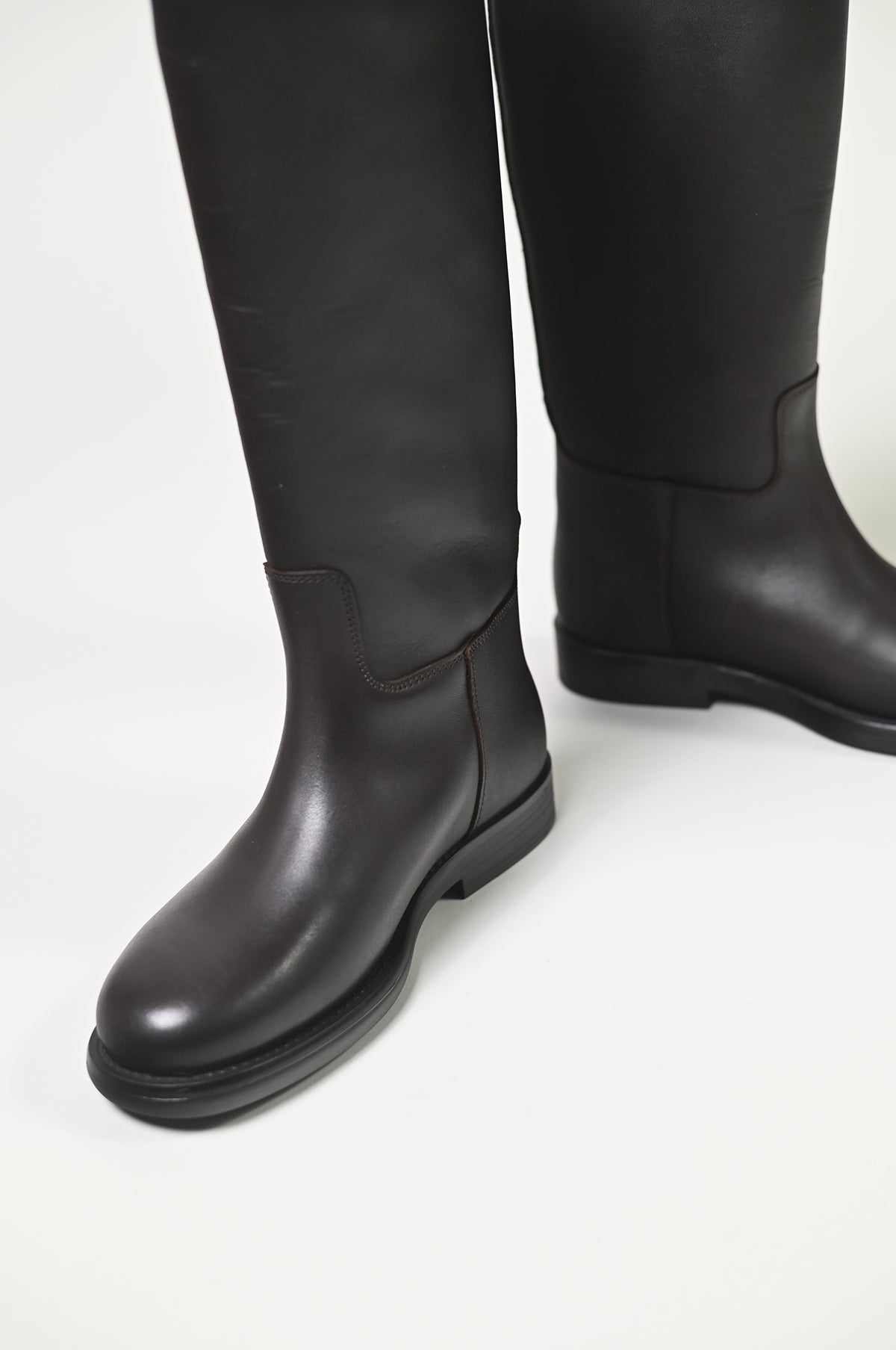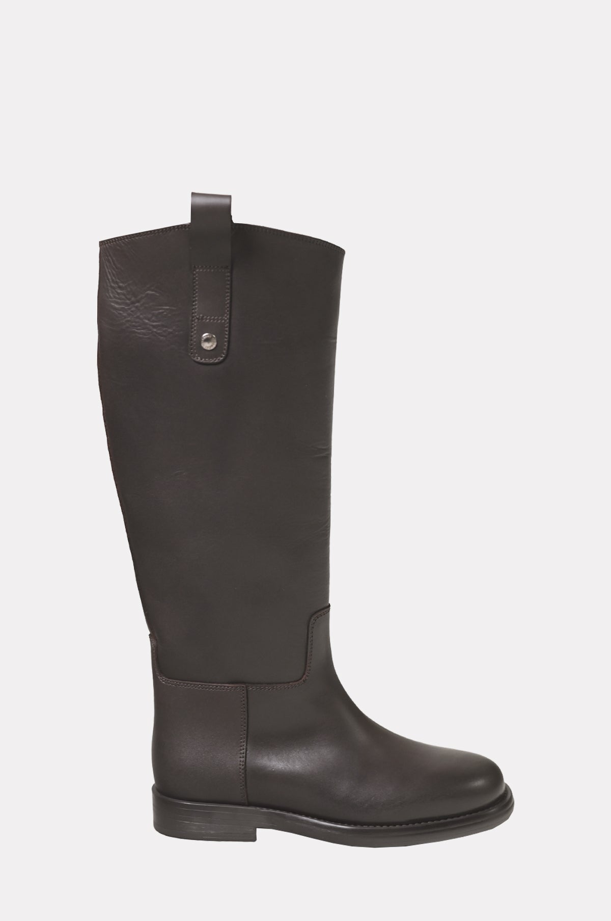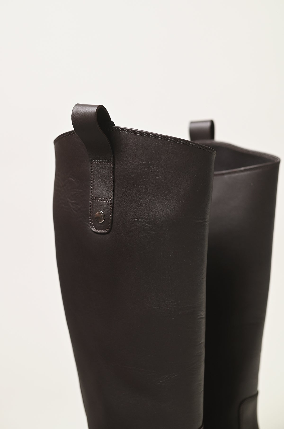 Constructed entirely by hand, the Eline Boot from Pavement is a classic knee-high riding-style boot in a dark brown. Its clean, considered shape is finished with a flat heel for timeless everyday wear. They offer a comfortable fit with a leather innersole and durable rubber outsole and will carry you from day to night dressing effortlessly. Also available in black.