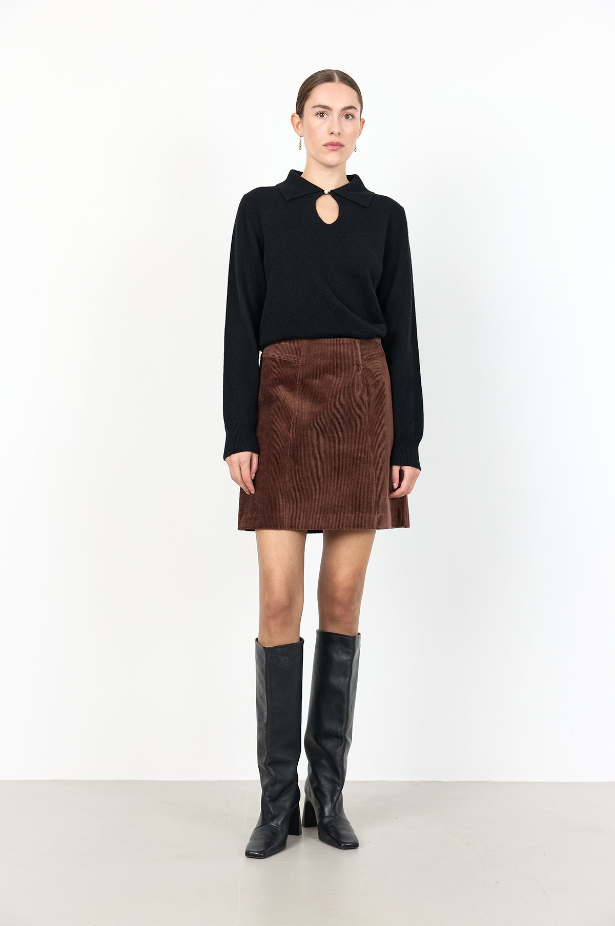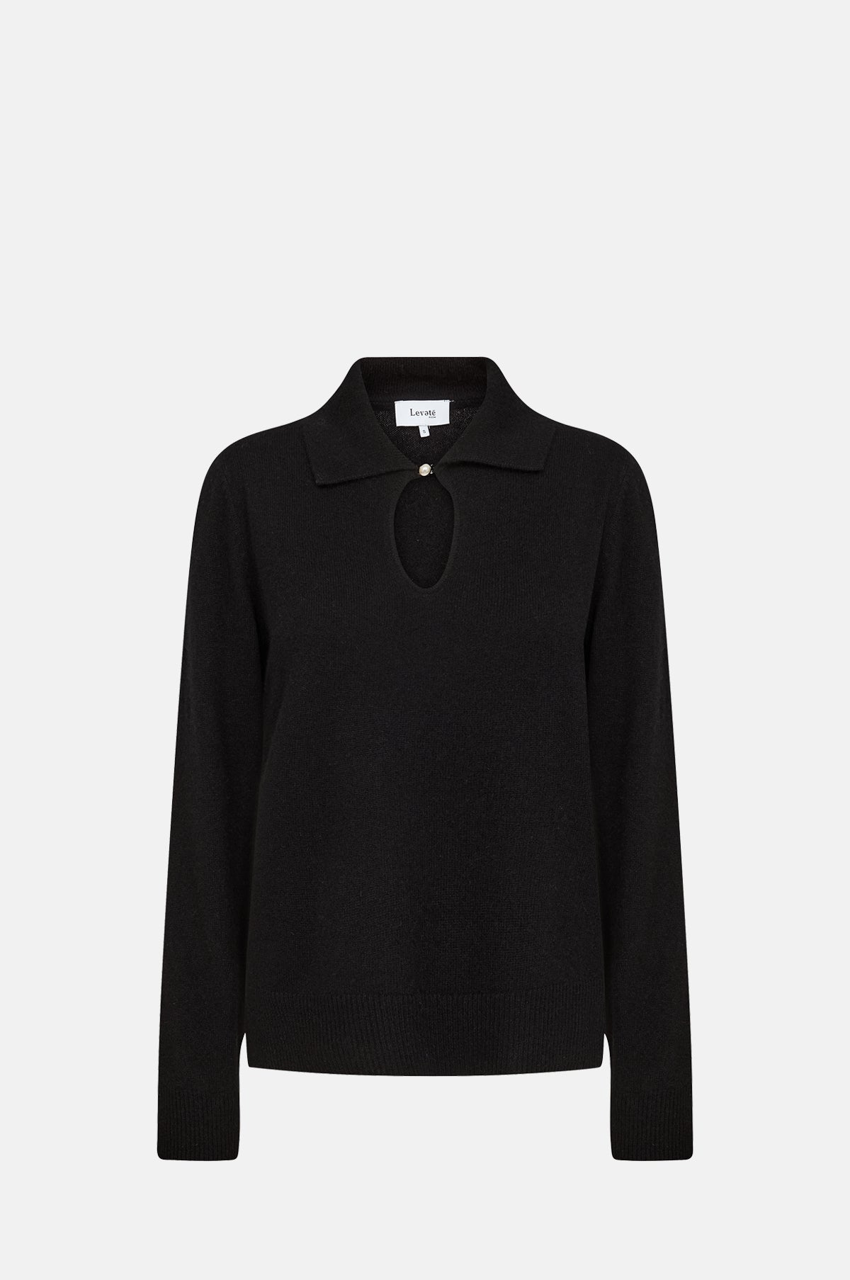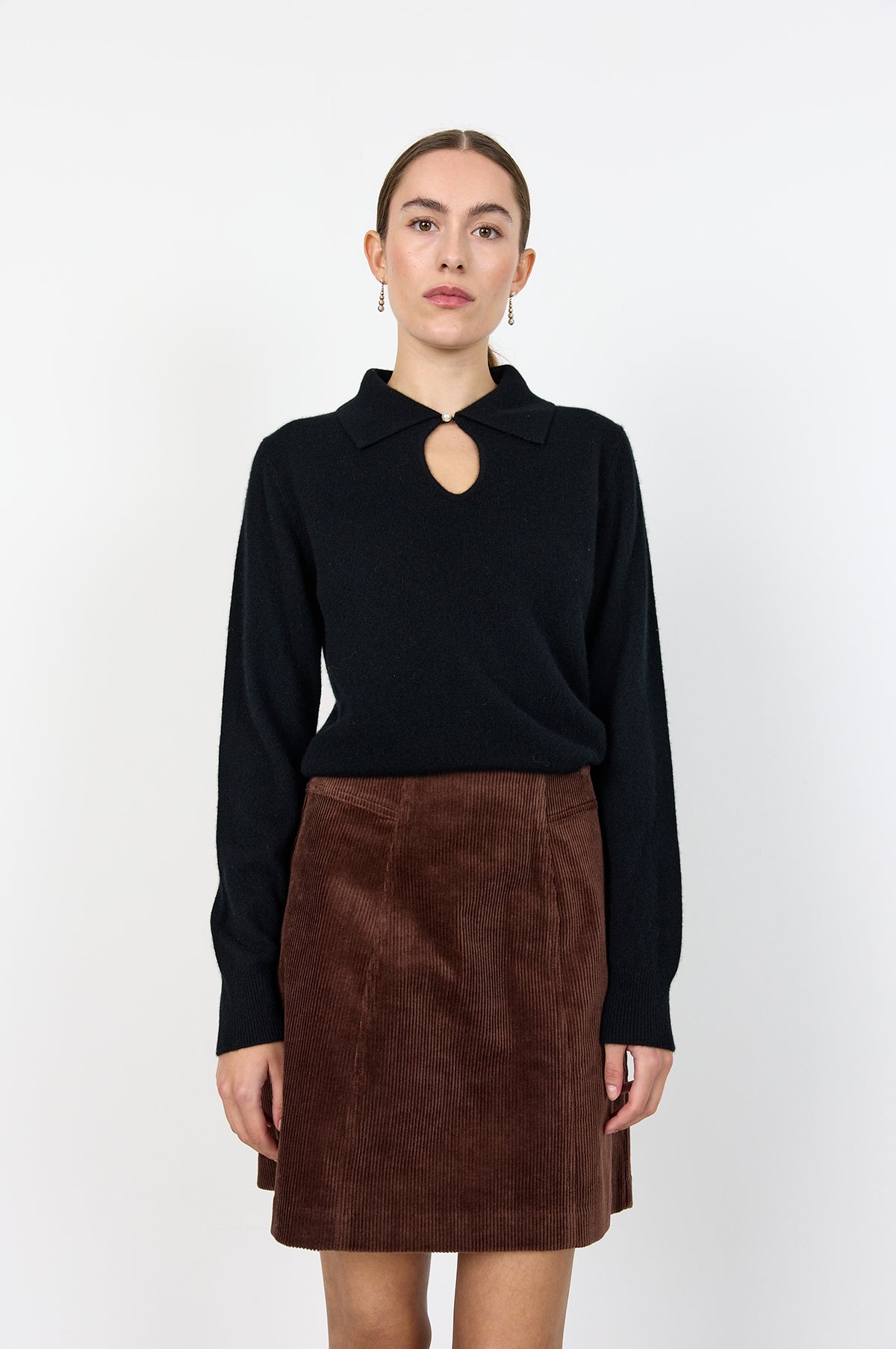 Perfect for pairing with tailored trousers or layering over a crisp poplin shirt, the Eloise Pullover from Levete Room offers refined elegance. Cut from a sumptuously soft cashmere this black knit features a unique keyhole detail with a pearl button closure. Wonderfully lightweight but still providing amble warmth this jumper is finished with a relaxed collar and ribbed cuffs and hem. Also available in hazelnut mel (brown).
