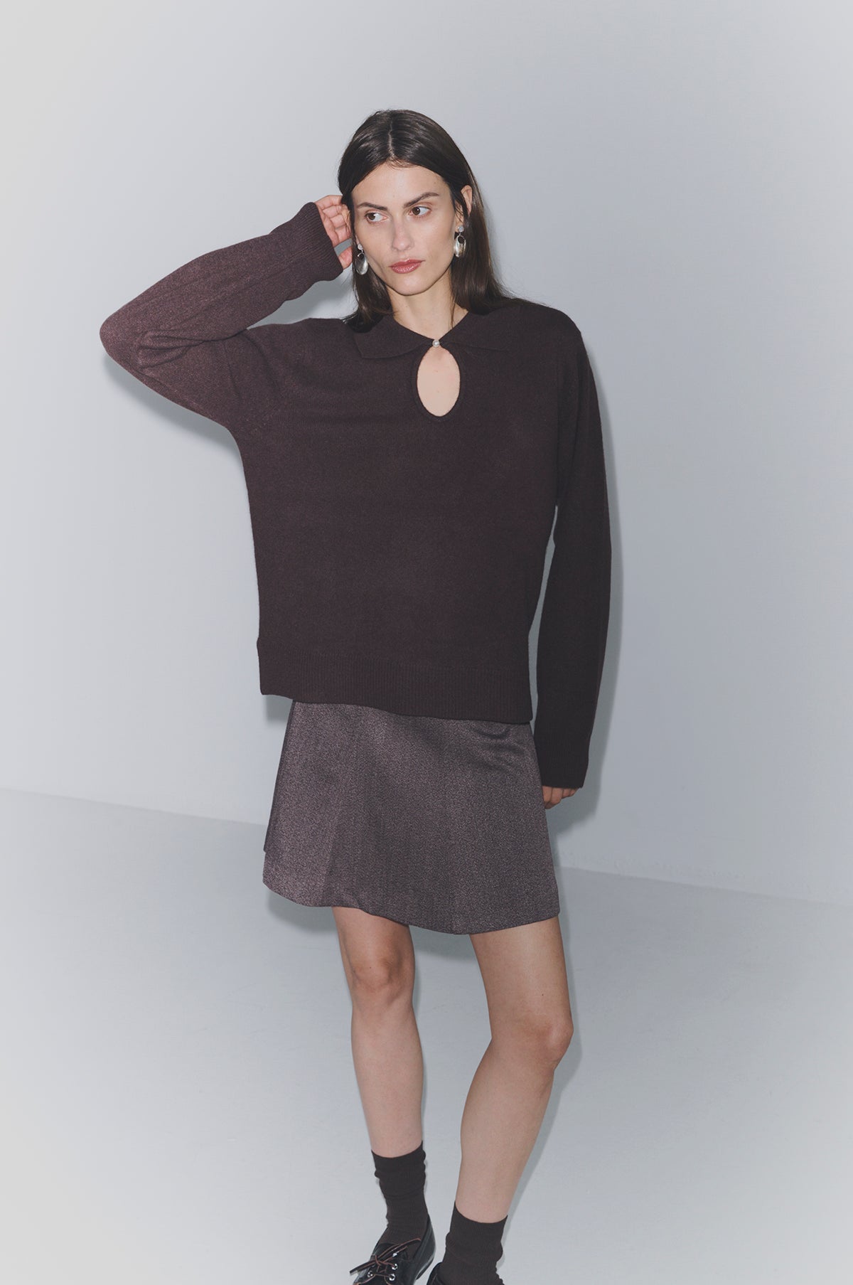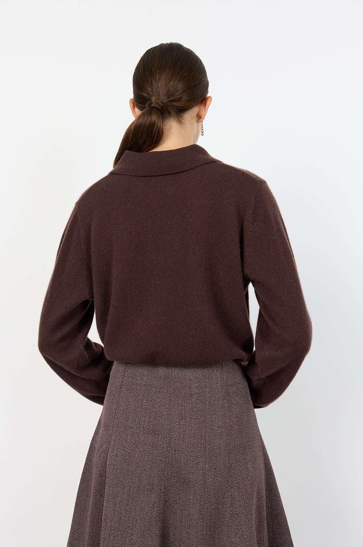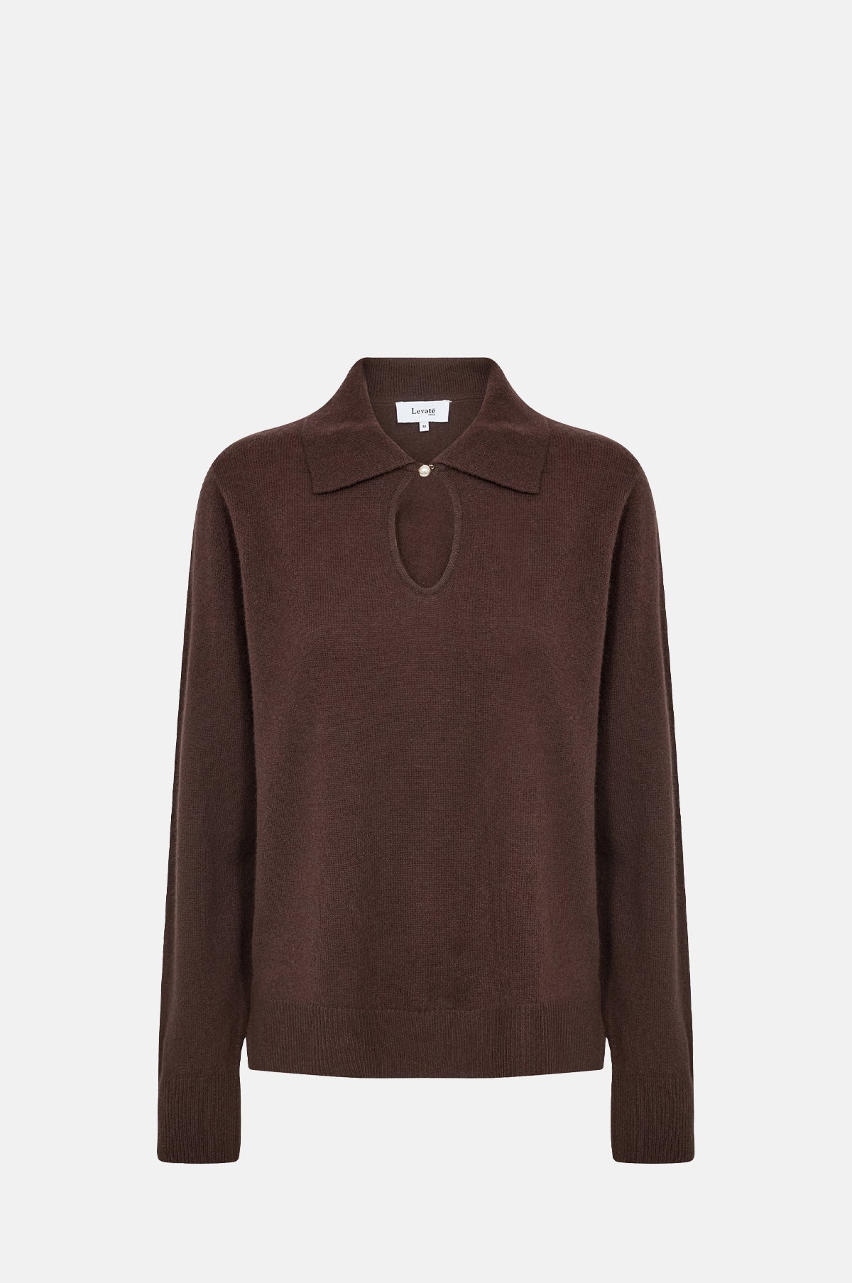 Pairing beautifully with tailored trousers or layered over a crisp poplin shirt, the Eloise Pullover from Levete Room offers refined elegance. Cut from a sumptuously soft cashmere in a rich brown this knit features a unique keyhole detail with a pearl button closure. Wonderfully lightweight but still providing amble warmth this jumper is finished with a relaxed collar and ribbed cuffs and hem. Also available in black.