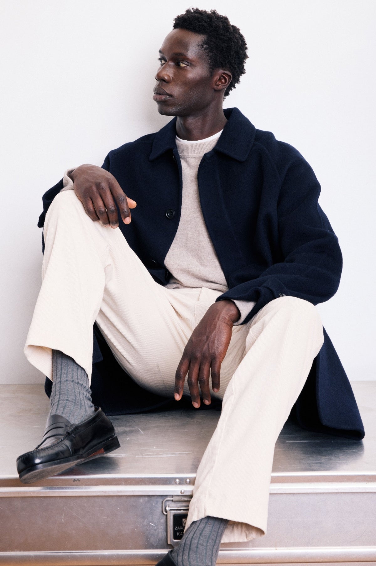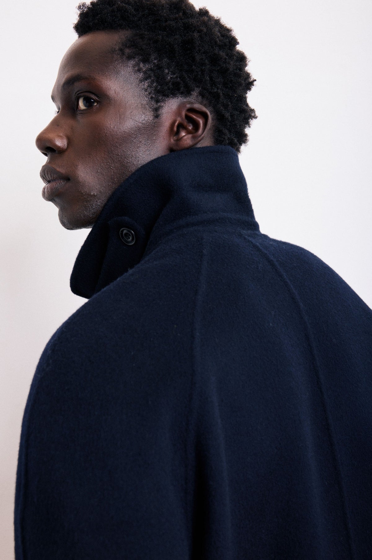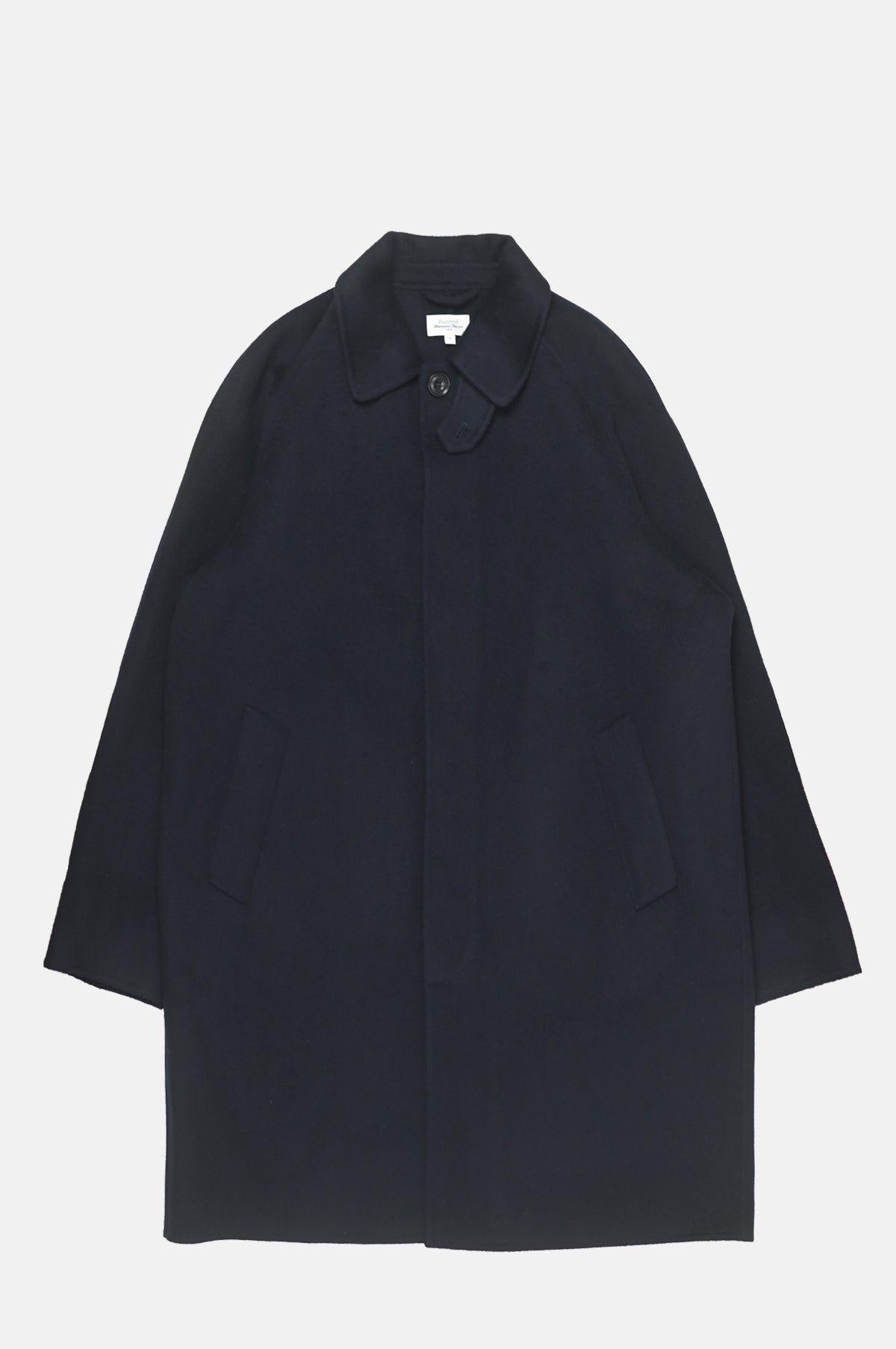 The Graig Coat in Navy from Hartford is a quintessential long wool coat constructed of a midweight double faced wool. The Graig is single breasted and features a hidden placket, raglan sleeve and 5 button closure.