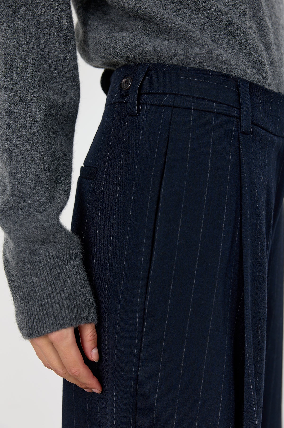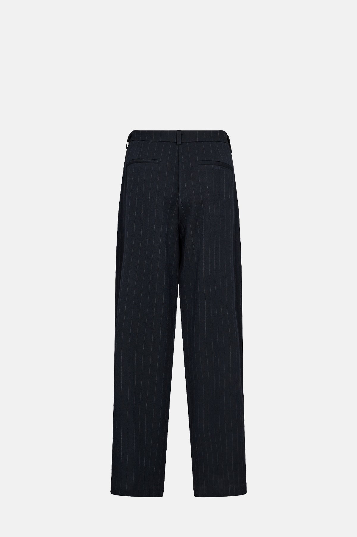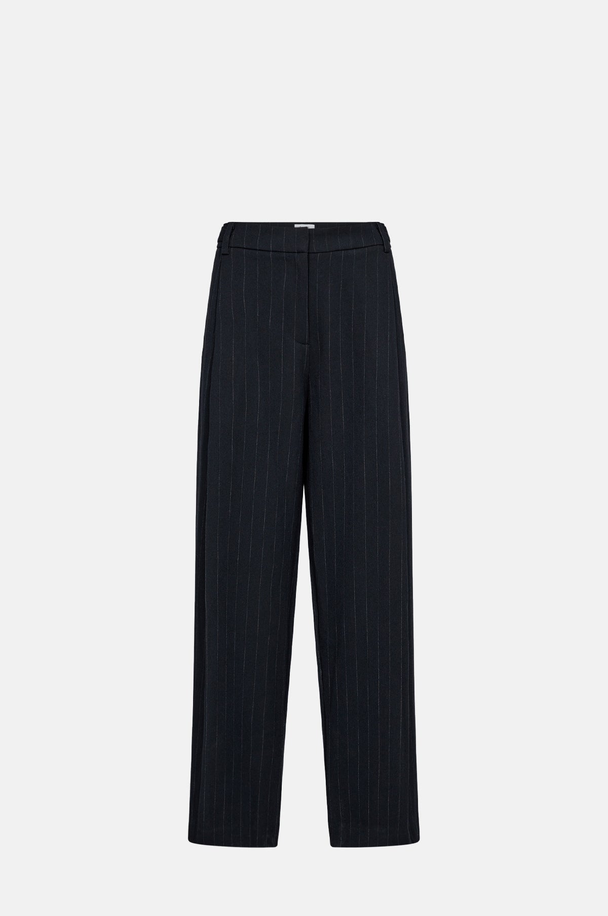 With understated details, the Olivia Pants in navy feature a subtle pinstripe and a flattering full-length cut. Singular stitched pleats create gentle volume and movement from the waistband. Faux side adjusters detail the waistband and a zip and hook and eye fastening complete the trousers. Pair with the matching Olivia Blazer for a matching two-piece suit.