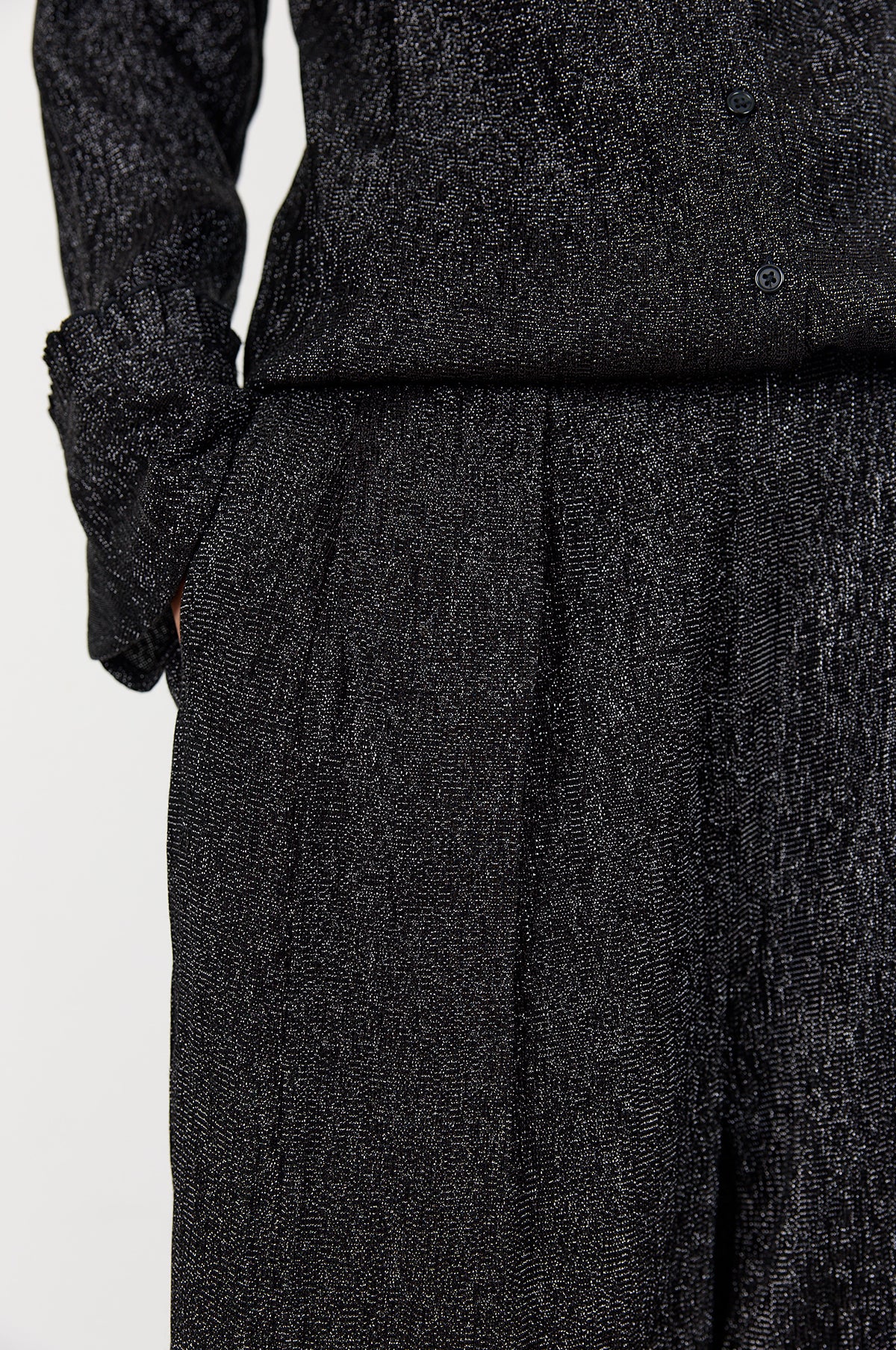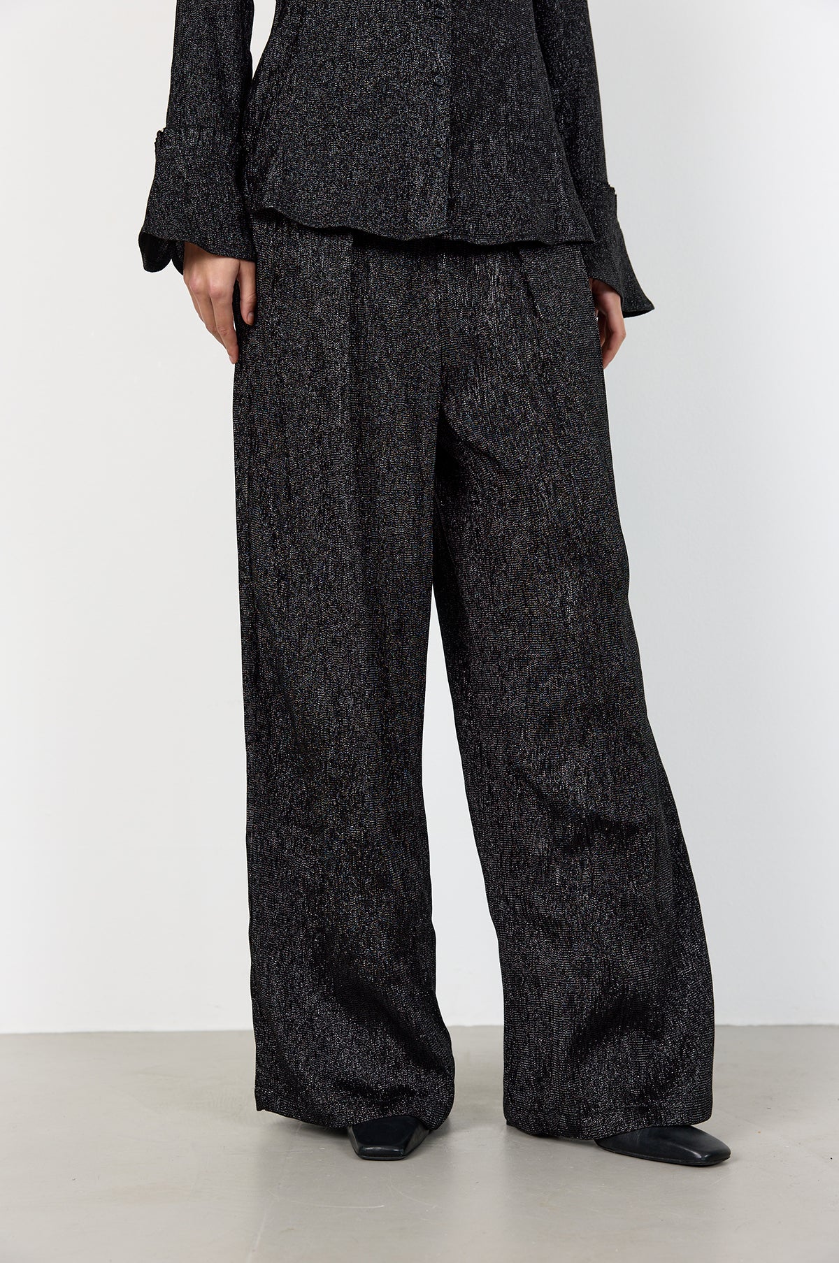 Earning a deserving spot in our AW25 collection, the Levete Room Otis Pants are gloriously sparkly. Perfect for effortless evening wear styling, these black trousers have a wide-leg fit which casts a graceful and flattering silhouette. Singular pleats add gentle volume and afford greater freedom of movement and an invisible zip fastening completes the design. We will be styling ours with a crisp poplin shirt and Mary Jane's.
