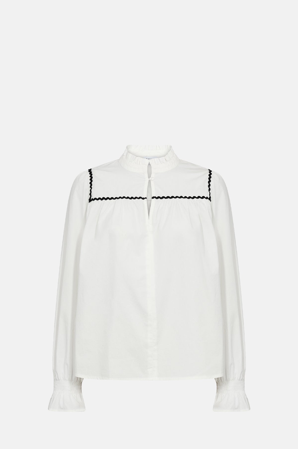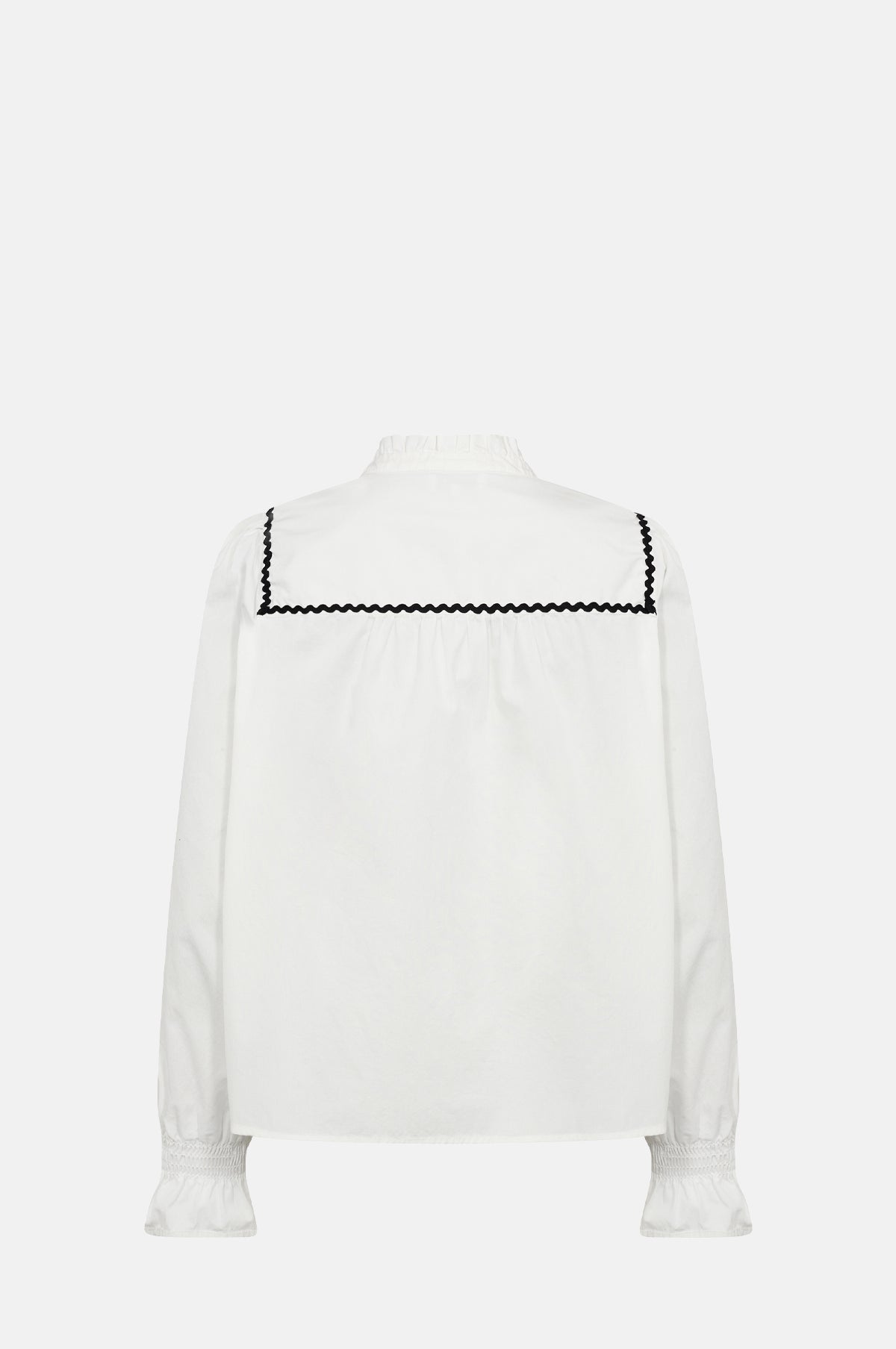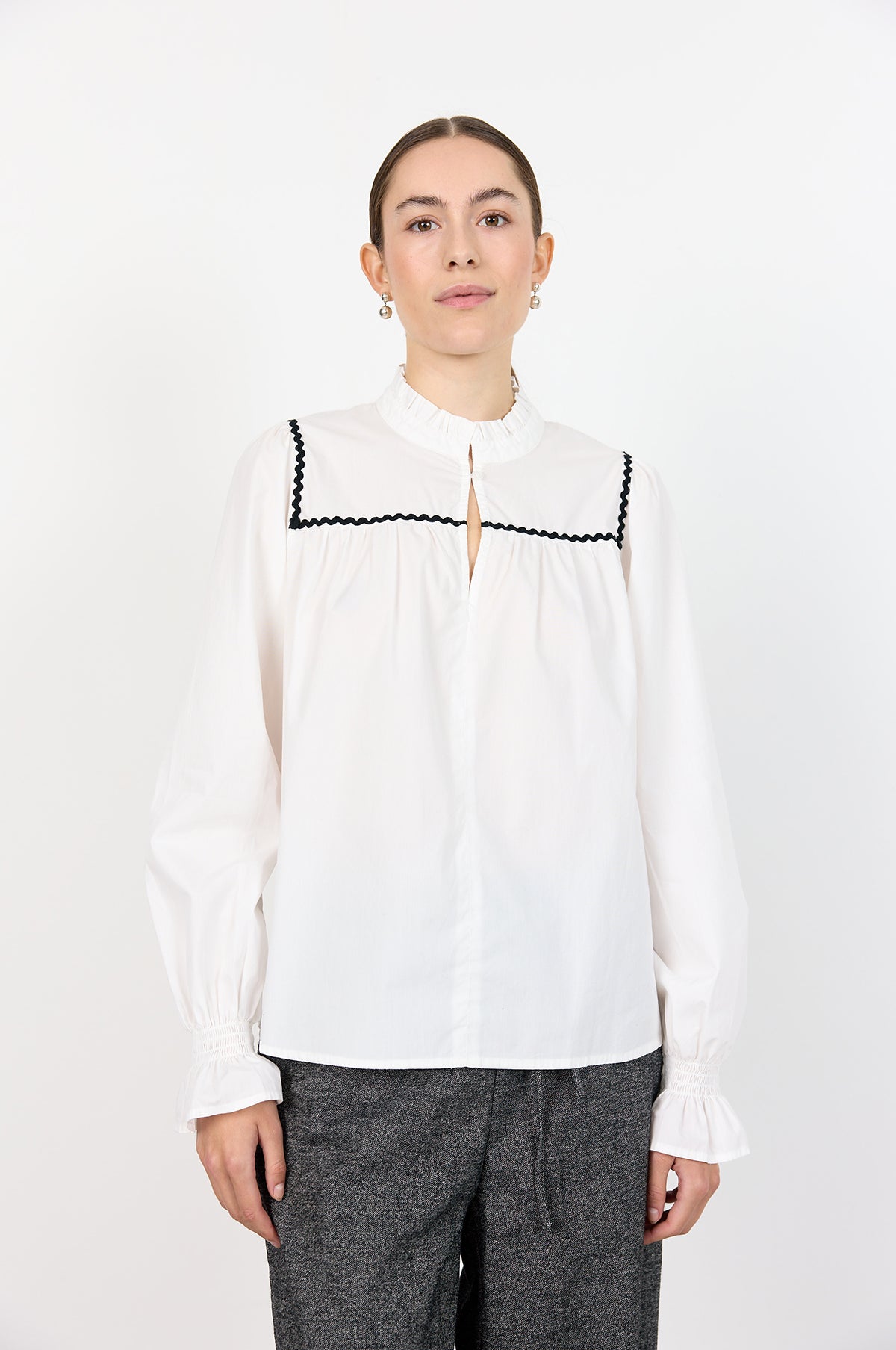 Spun from a crisp white cotton poplin, the Otto Blouse is abundant with delicate details which amount to an elegant blouse. Featuring a ruffled collar, smocked cuffs, button keyhole closure and a ric rac trim which runs around the yoke. Full of feminine charm, this blouse will make a wonderful companion to denim.