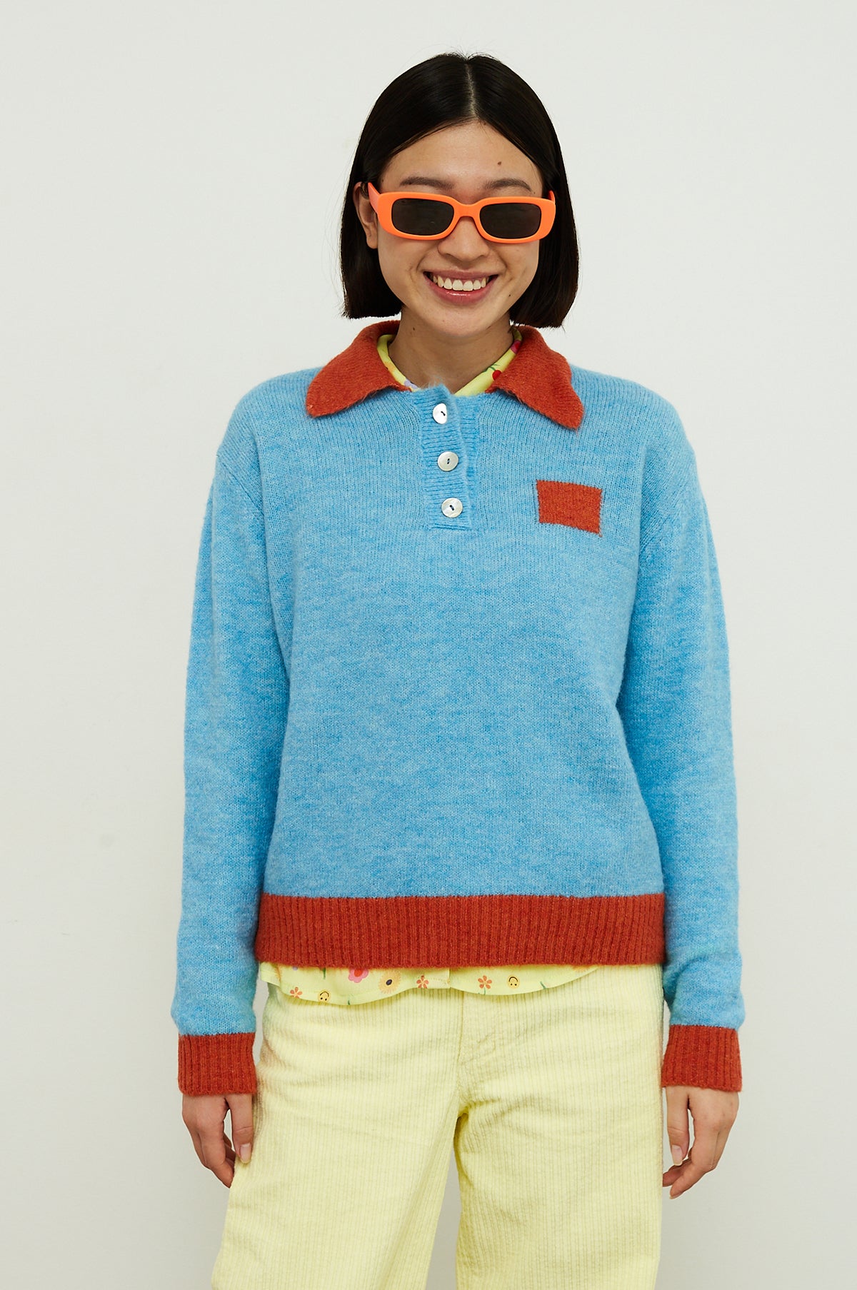 Cheerful and soft, you're sure to stand out in this colourful polo knit jumper from Dr Bloom. In a bright blue with orange contrast on the collar, hem, square chest detail, and cuffs it has a straight cut and wide lapel collar accented by three mother of pearl buttons at the neckline. Pair with jeans or simple corduroy trousers for a fun autumnal look.