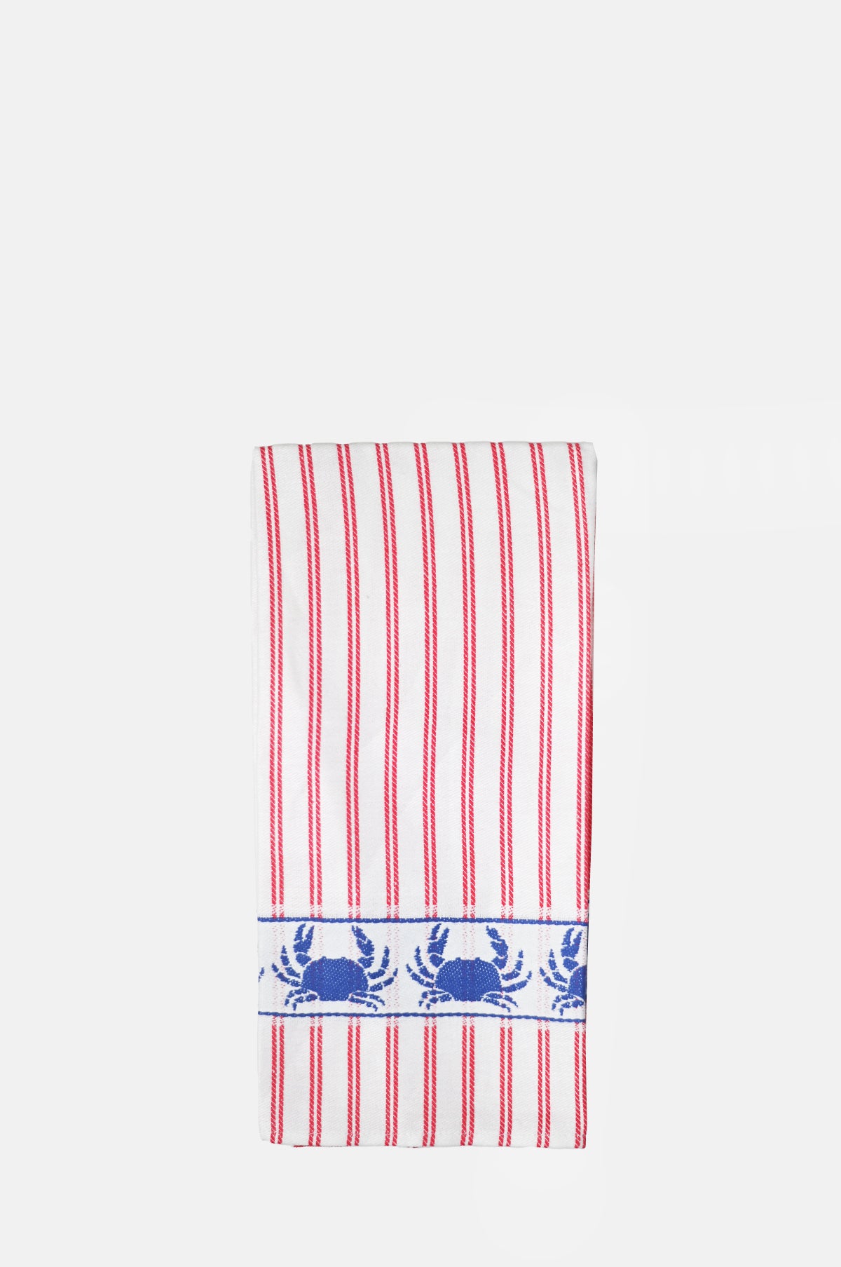 Clobber for the kitchen has never been more beautiful. Patterned with a vertical red and white stripe, this tea towel features a repeating blue crab motif that borders the top and tail. Woven from a weighty cotton and linen mix, this tea towel makes for great gifting to any host or home cook.