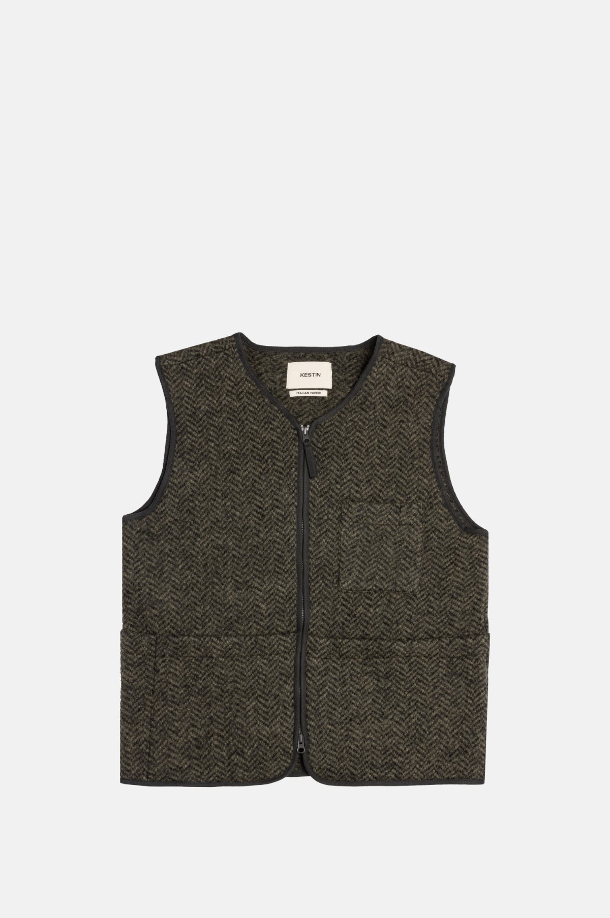 The Bute Vest in Herringbone Wool in Moss features three patch pockets and trim around the edges which gives the piece a clean look without sacrificing on utility. The Bute vest is made from a heavy wool fabric with a herringbone subtle herringbone pattern and features a slightly relaxed fit ideal for layering.