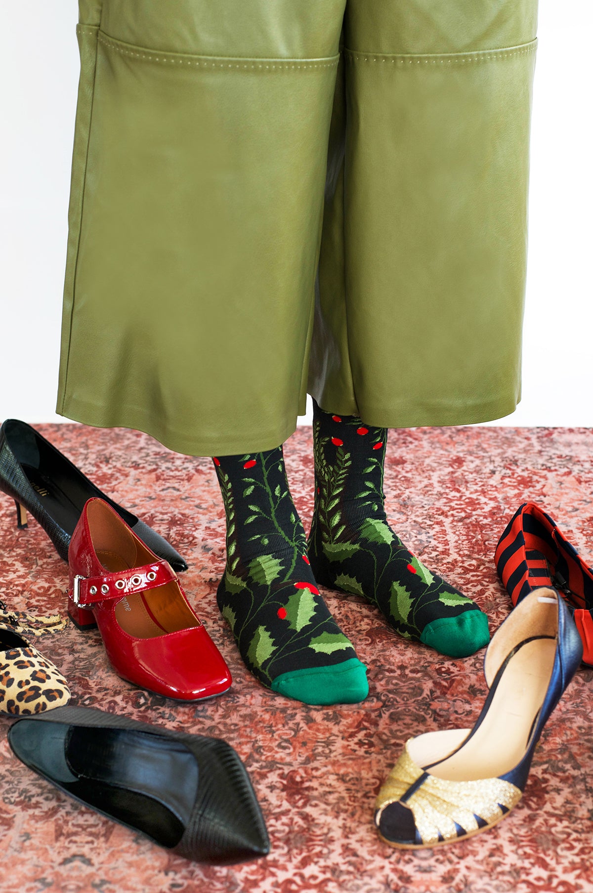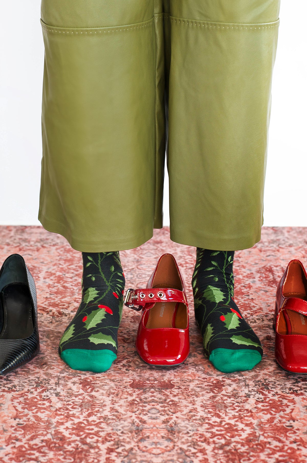 Bonne Maison design fabulous high-quality socks which look good enough to frame! This pair are woven in black with a cheering holly print. A pea green toe completes the design.