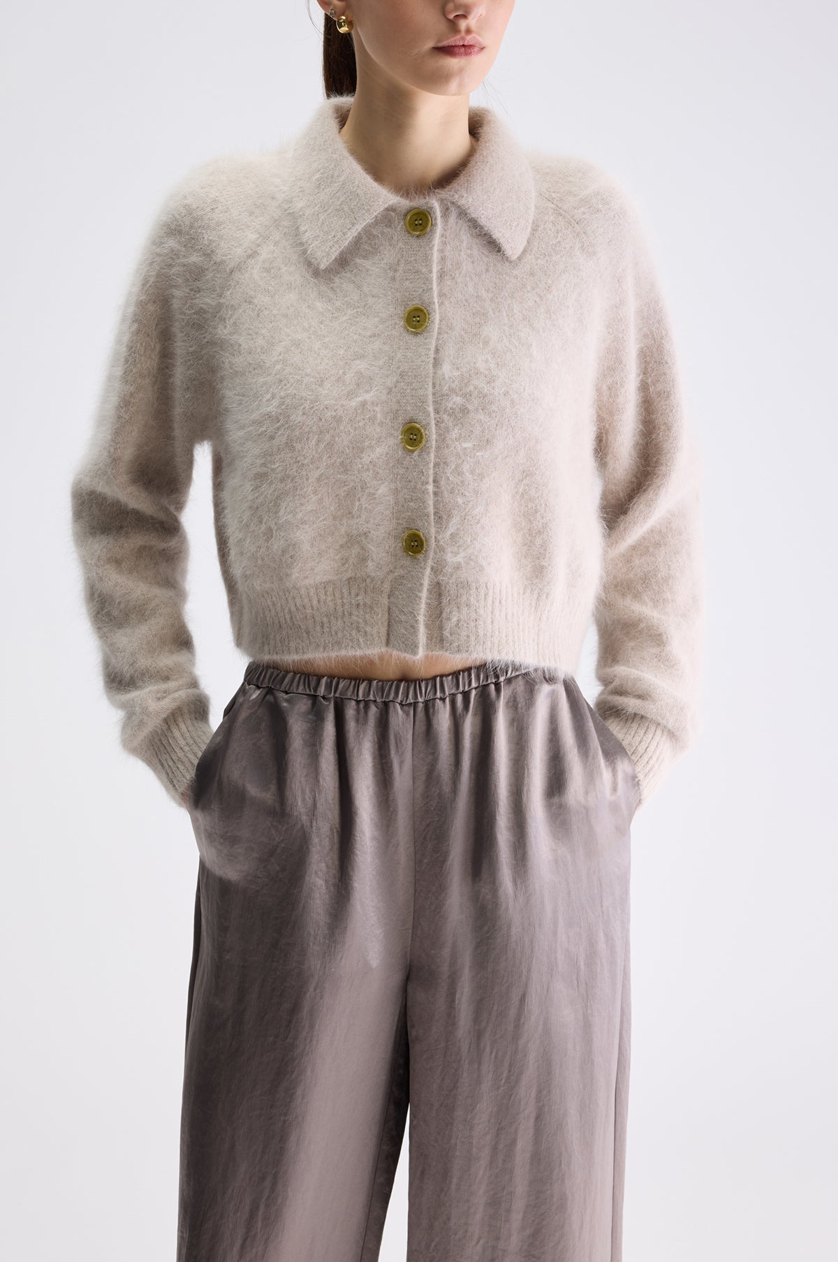 Soft and lightweight, the Datco Knit is a lovely piece for everyday wear. Relaxed in fit with a cropped length, this angora blend cardigan comes in a soft oat colourway. With a contrasting olive button front closure, spread collar and long cosy sleeves, this cardigan is perfect for seasonal layering.