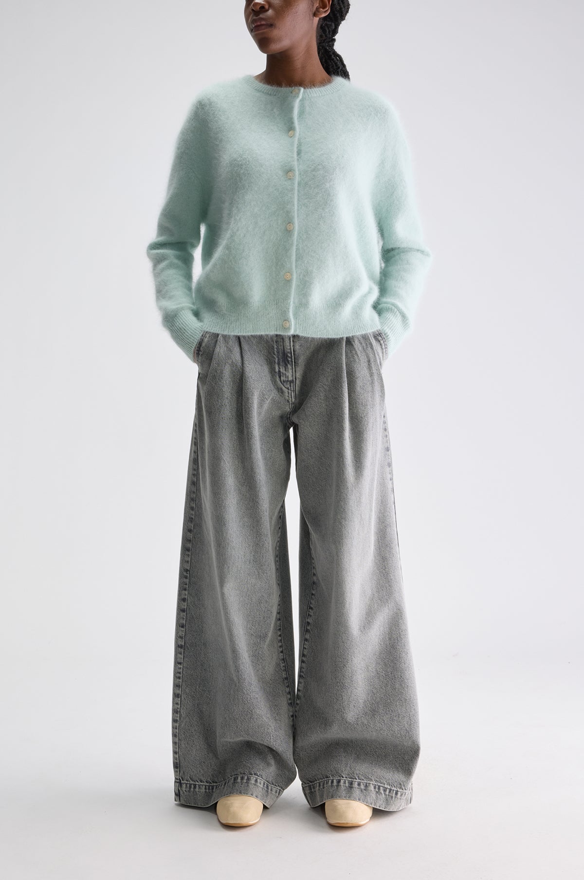 In a gorgeous shade of ice blue and woven from a downy Angora blend, this fluffy cardigan from Bellerose feels relaxed and luxurious. With its crew neck, simple buttons, and slim fit - it has a classic shape that will add a dash of elegance to any outfit.