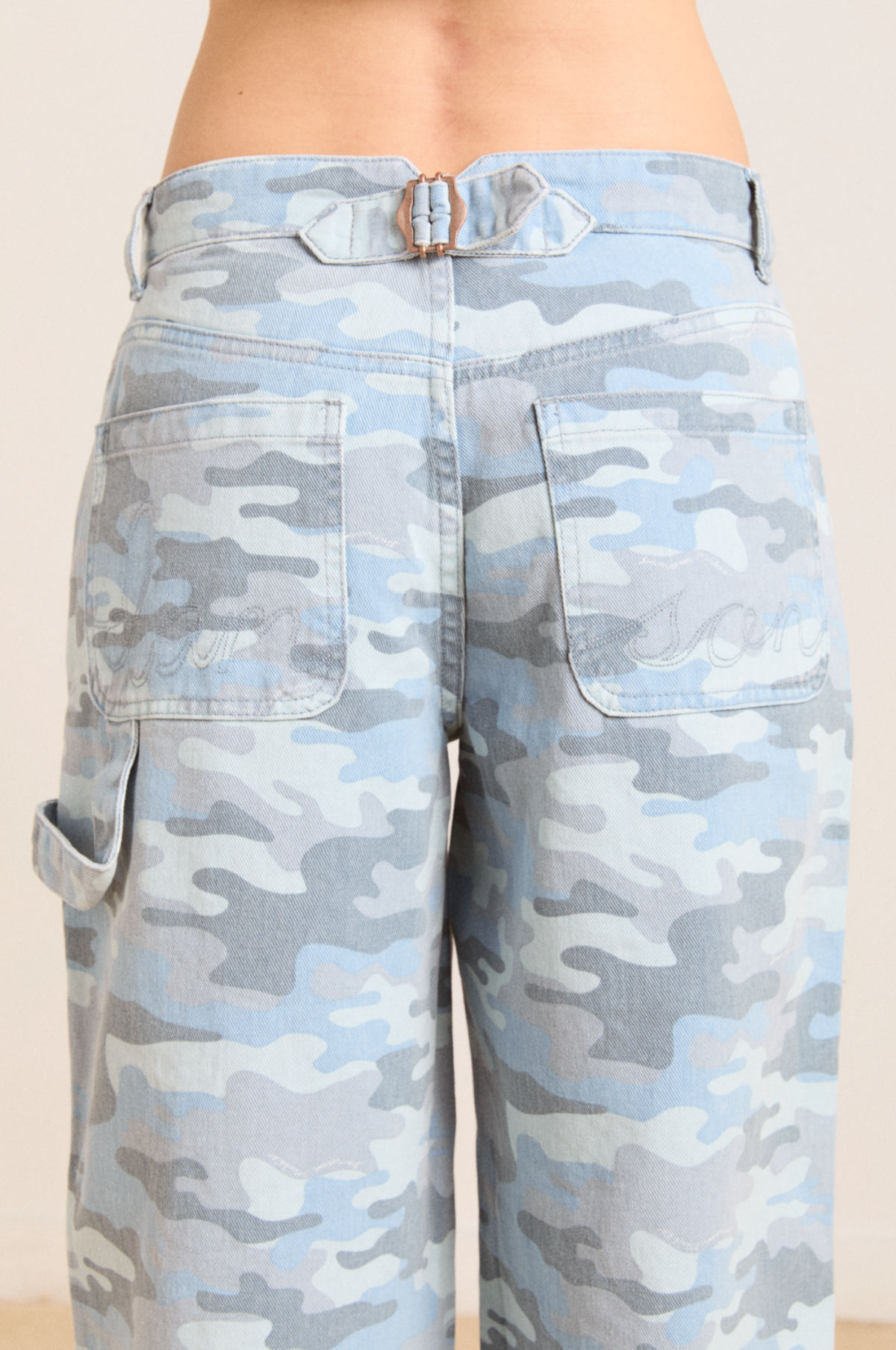 - Mid-rise jean with blue camo print