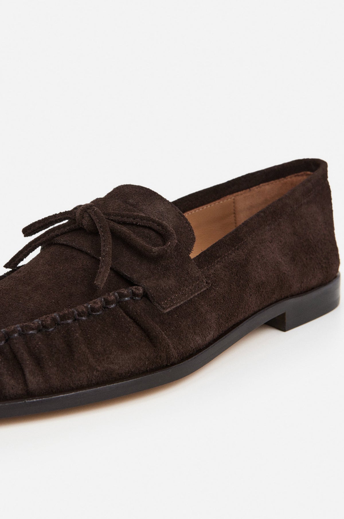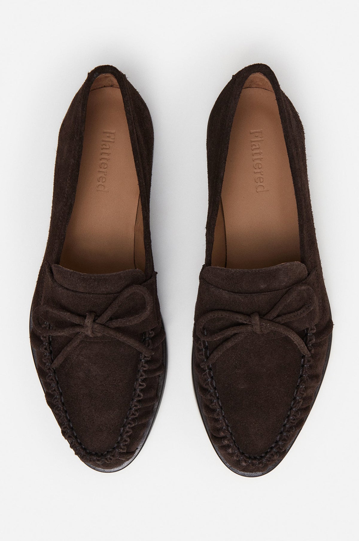 Crafted from a rich chocolate brown suede, the Dylan loafer offers structured formality. Featuring a leather piece across the vamp, ballet bow and gathered style stitching. A classic silhouette to pair with jeans or skirts.