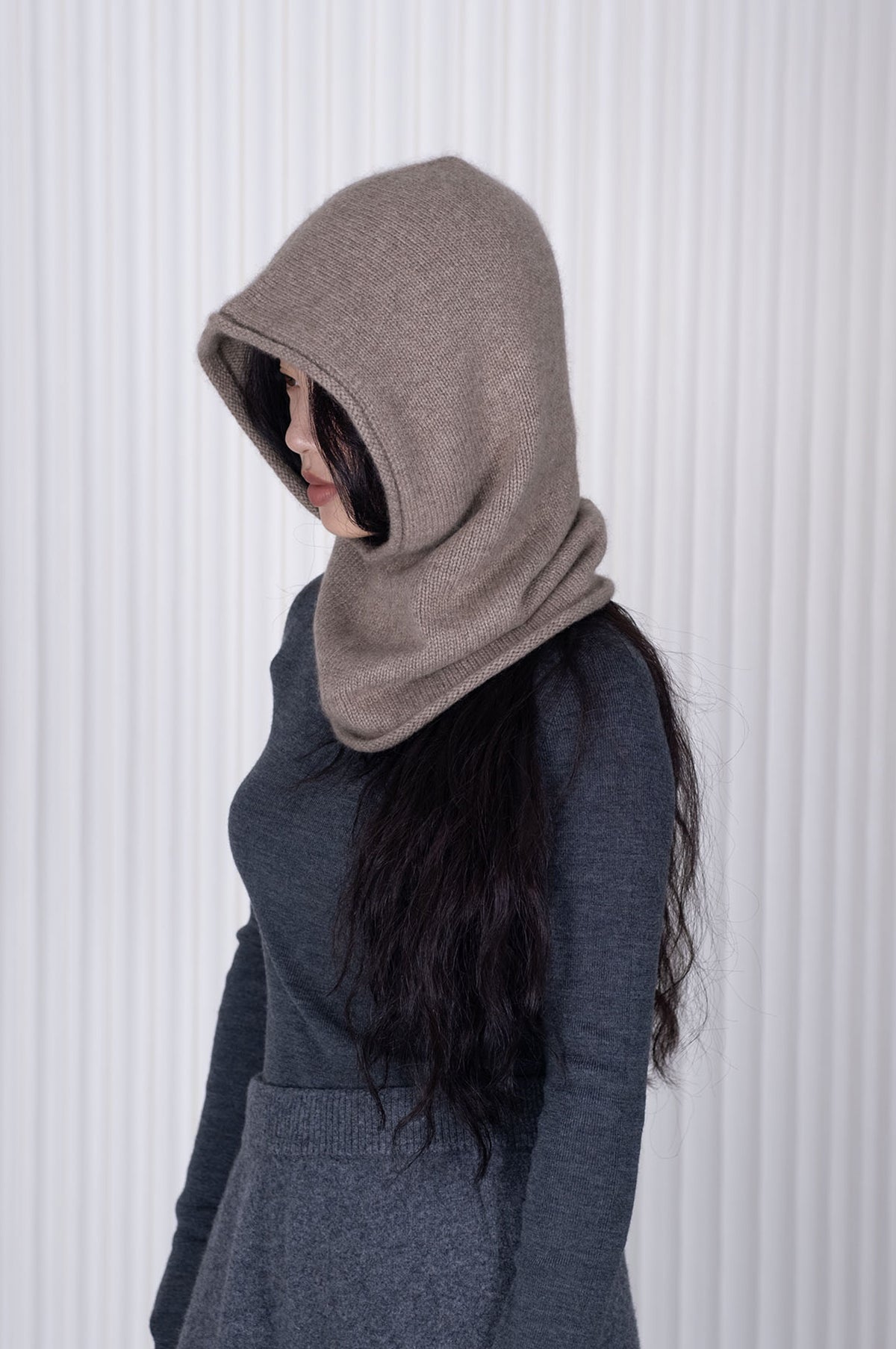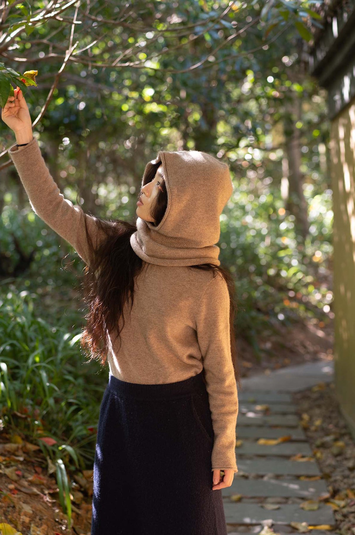 You will not be able to resist this taupe brown 100% cashmere balaclava, a versatile essential for the colder months. This balaclava seamlessly transitions between a neck warmer and a beanie, providing warmth and style in one. Crafted with luxurious thick knit cashmere, it ensures unparalleled comfort whether you wear it up or down. Sumptuously soft, this is the ultimate balaclava with the perfect relaxed fit that doesn't fall off when you have it pulled up!