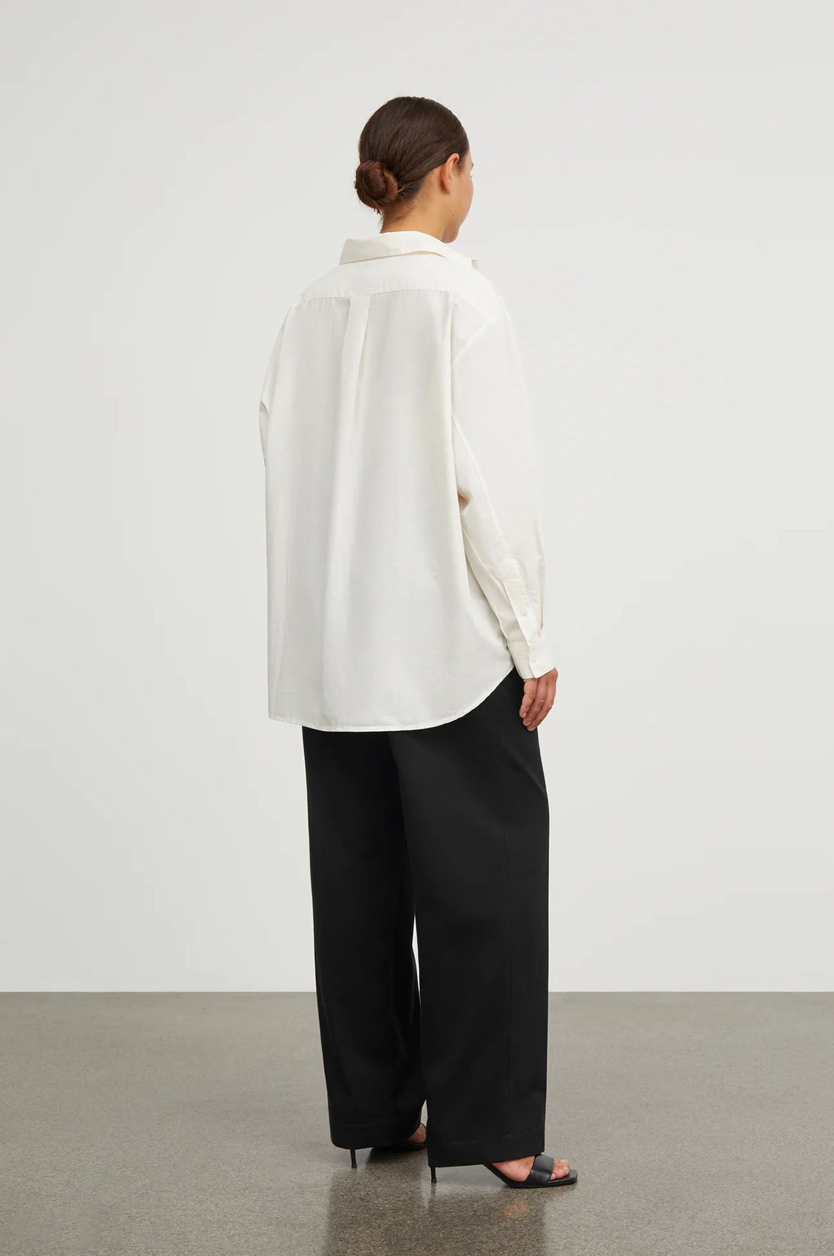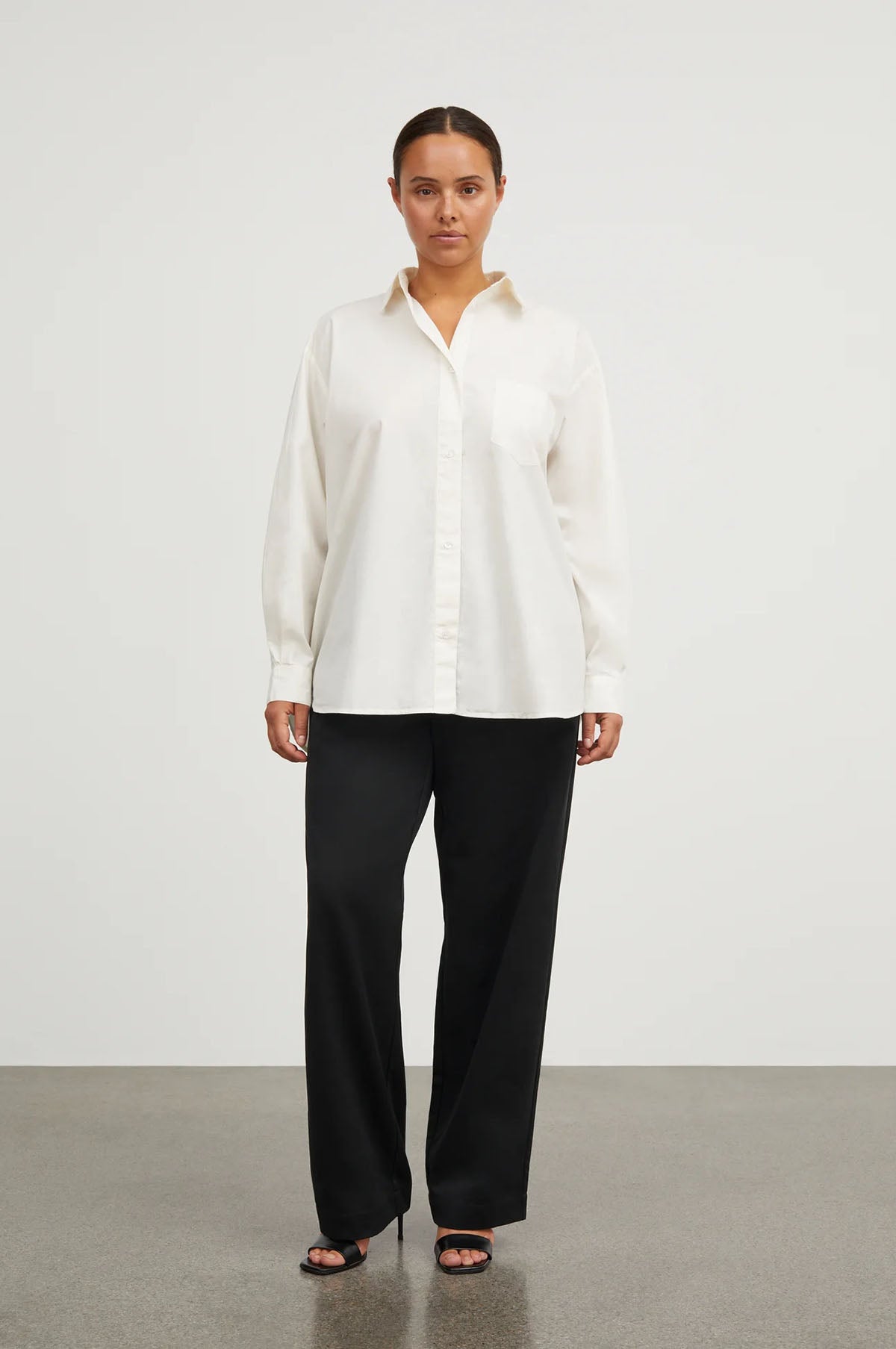 The Edgar shirt is an oversize menswear inspired shirt crafted from organic cotton poplin. The cool oversized fit serves that same feeling as the shirt we tend to borrow from his side of the closet, or the classic broad-shouldered coat found in a chic vintage shop. The light cream colour of this shirt adds a softness to it which enhances its ability to move seamlessly from workwear to weekend attire.