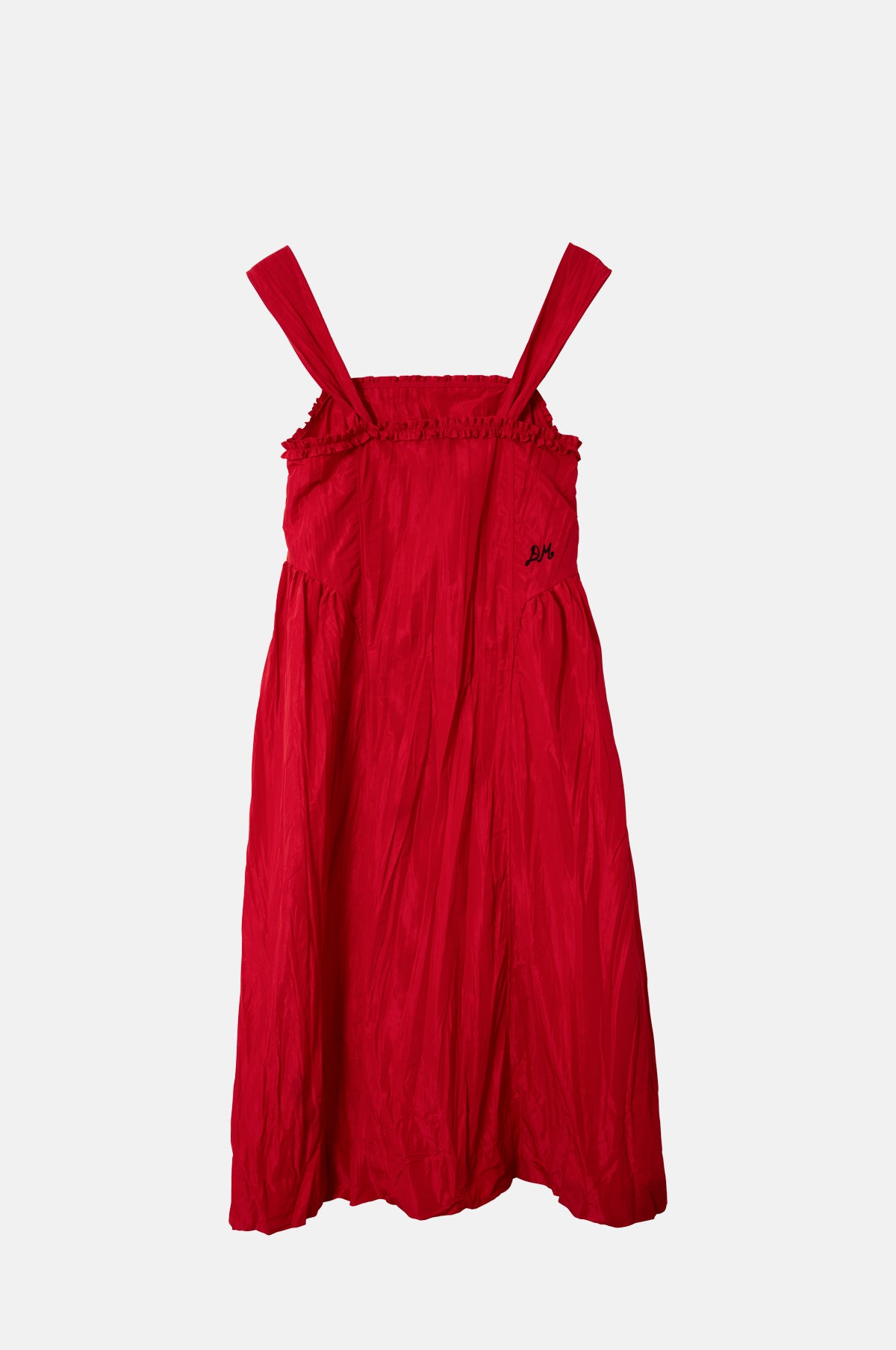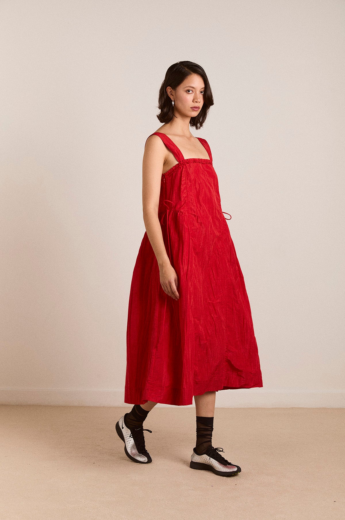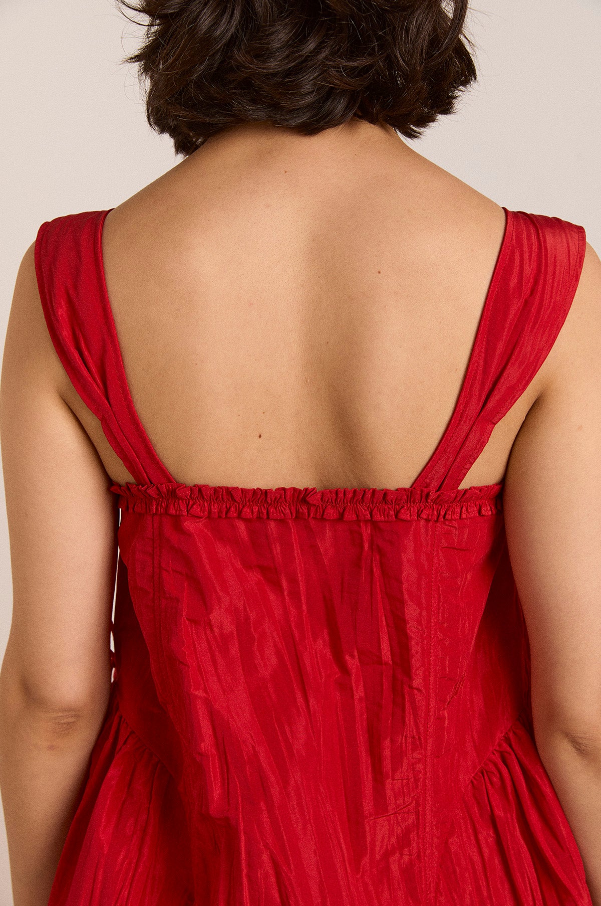 Meet the Elina Midi Dress from Damson Madder - your new go-to. Made from a red taffeta fabric which hangs from a ruffled square neckline and provides a softly structured shape. In a striking red, this sleeveless dress makes a statement and is perfect for dressing down with trainers or up with kitten heels and a pair of patterned socks.