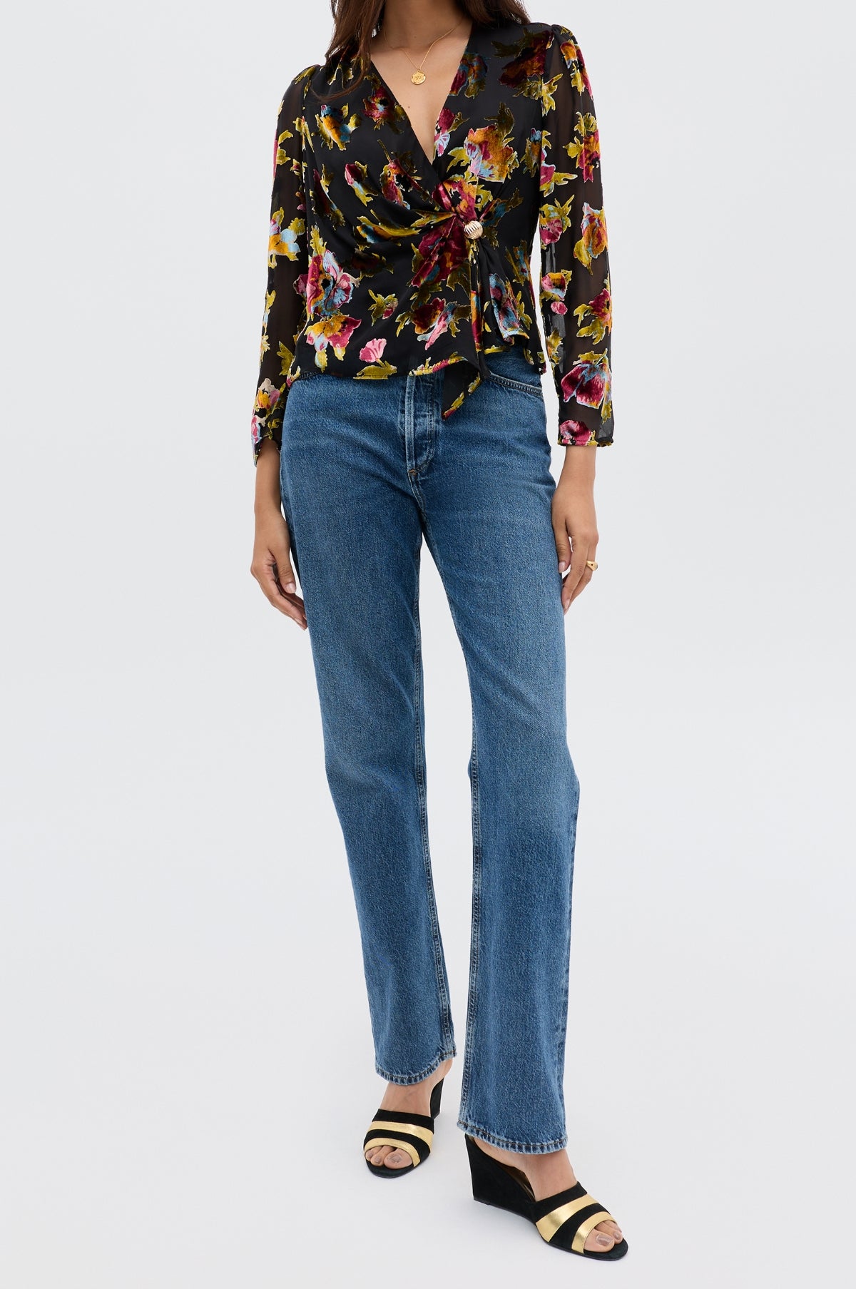 Inspired by the vibrant, eclectic energy of the '80s, the Everlyn Top from Rixo is crafted from a luxe devoré and patterned with a vintage-inspired floral print. Exuding sleek sensuality, it features a twisted, wrap-around silhouette and fastens with a striking gold clasp.