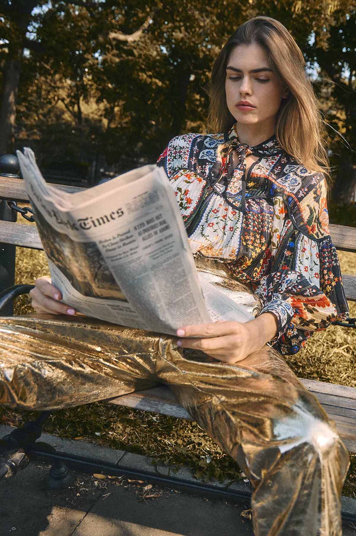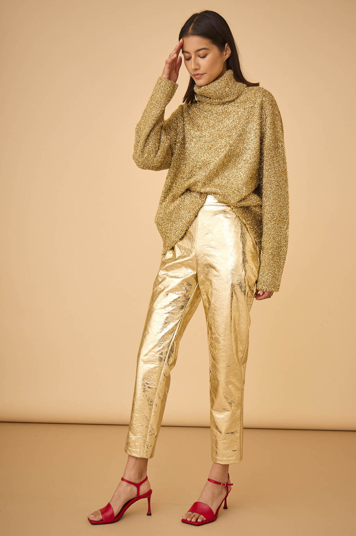 Put your party hat on because these cracked gold trousers from Hunter Bell will certainly help you to make an entrance. With a fitted waist, side seam zipper, and slash front pockets, these pants are tailored for a flattering fit. Made from crackled gold faux leather we love the Studio 54 vibe of these modern disco pants.