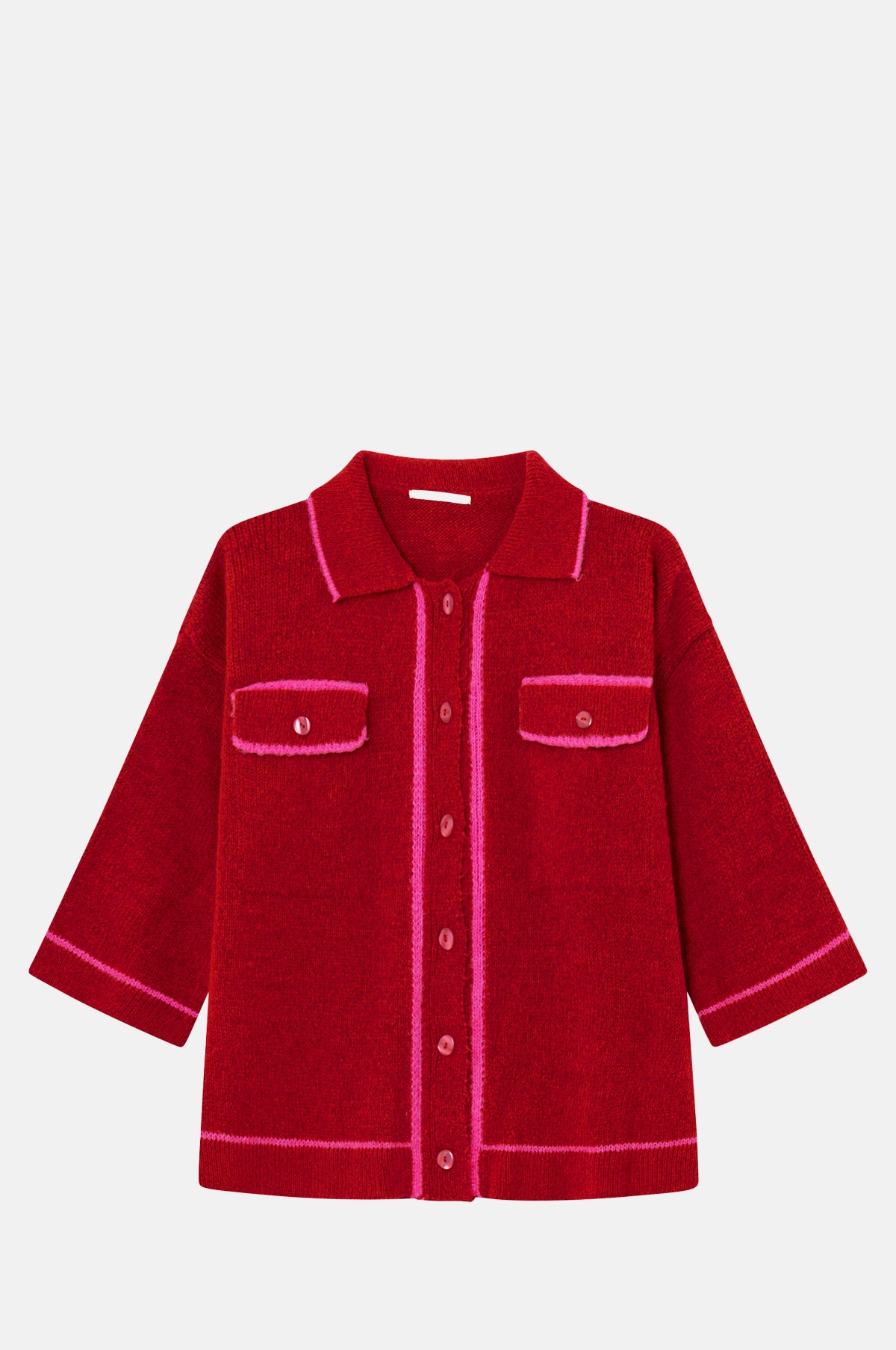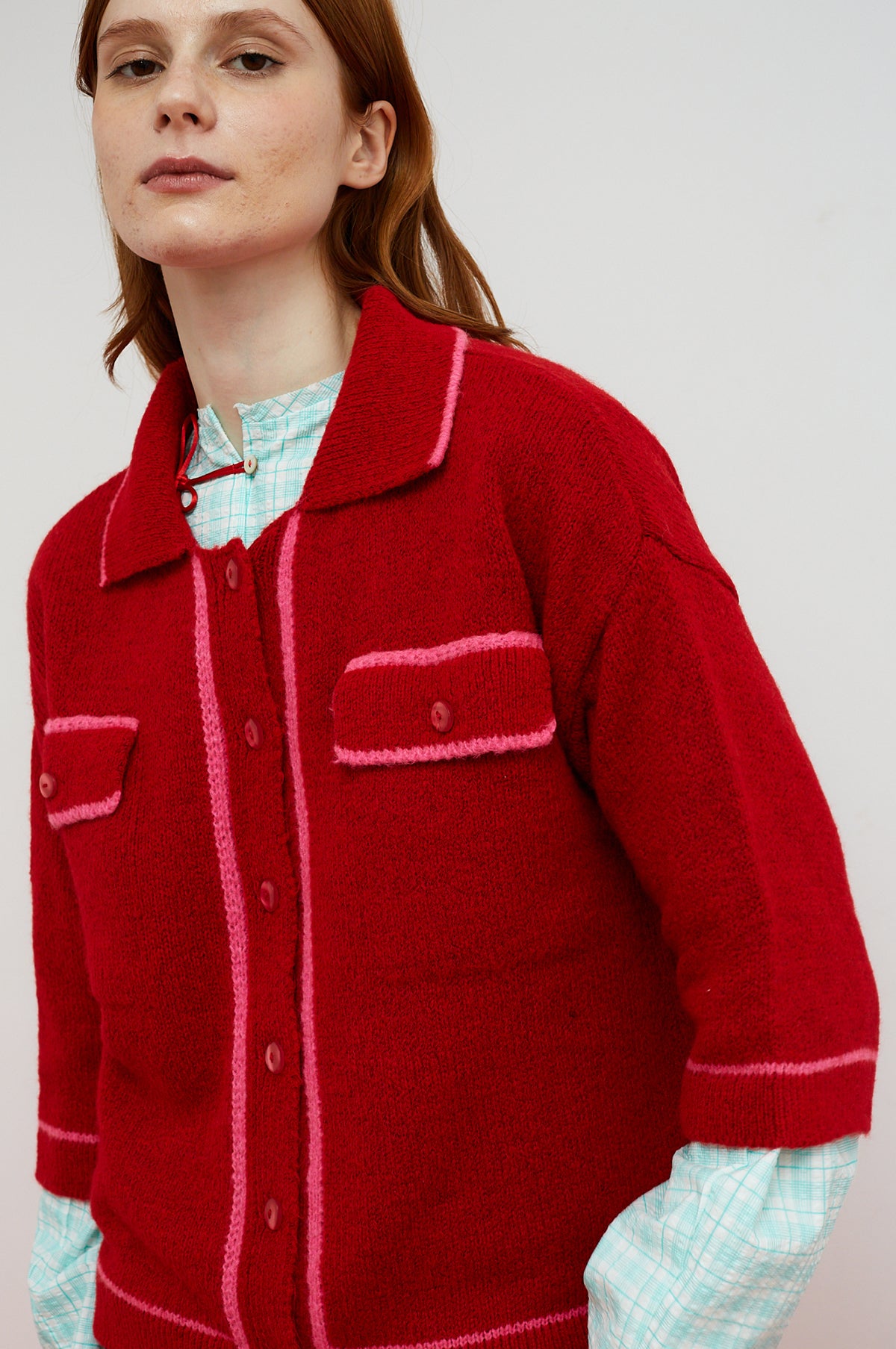We love a jolly coloured cardigan and this cherry red one with neon pink trim from Dr Bloom is especially sweet. Woven from a soft wool blend, it has a straight cut, a ribbed lapel collar, and front buttoned pockets.