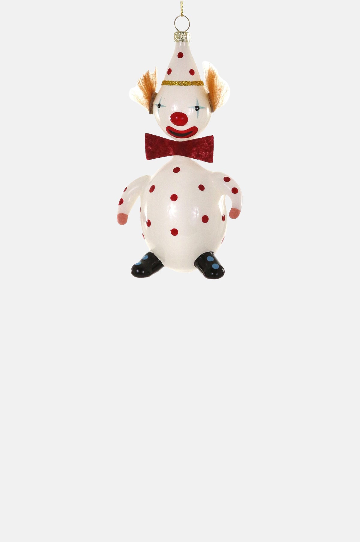 This clown is a jolly old chap, patterned in polka dots and sporting a red felt bow tie. Two tufts of hair and a sparkly gold rimmed hat completes his festive attire. Made of glass, he is sure to add some kitschy joy to your tree.
