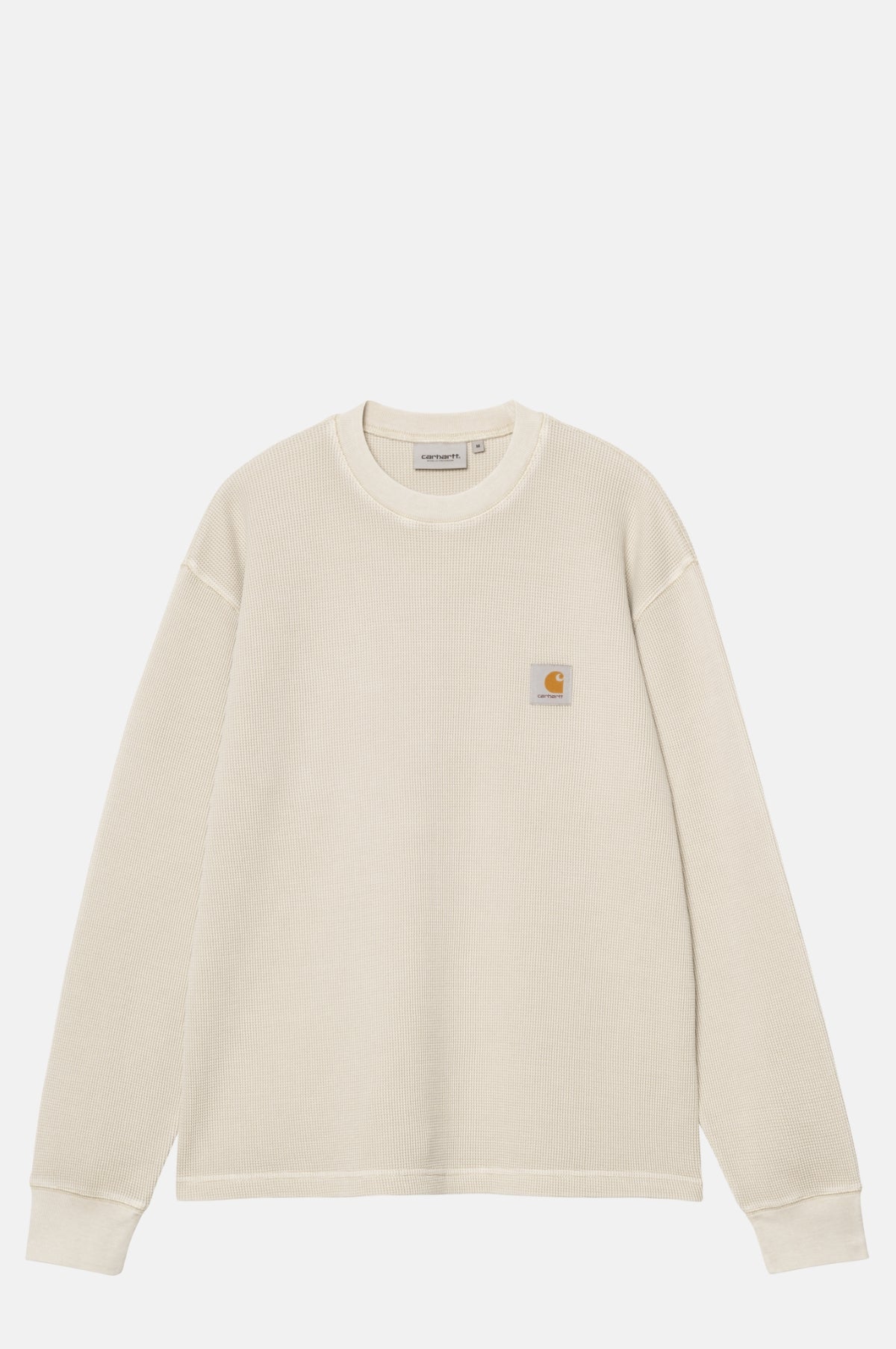 Designed for warmth and texture, this long-sleeve Carhartt WIP tee is an immediate upgrade to any casual outfit. It features a generous loose fit and is constructed from a substantial 350gsm heavyweight cotton waffle fabric which is superb for layering. The garment has been expertly dyed to achieve the subtle, complex Fleur De Sel colourway and a distinctively soft feel. A classic woven Square Label is positioned neatly on the chest, marking this out as a premium winter basic for those who appreciate high-quality textured apparel and serious comfort.