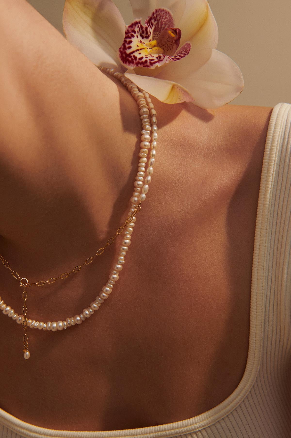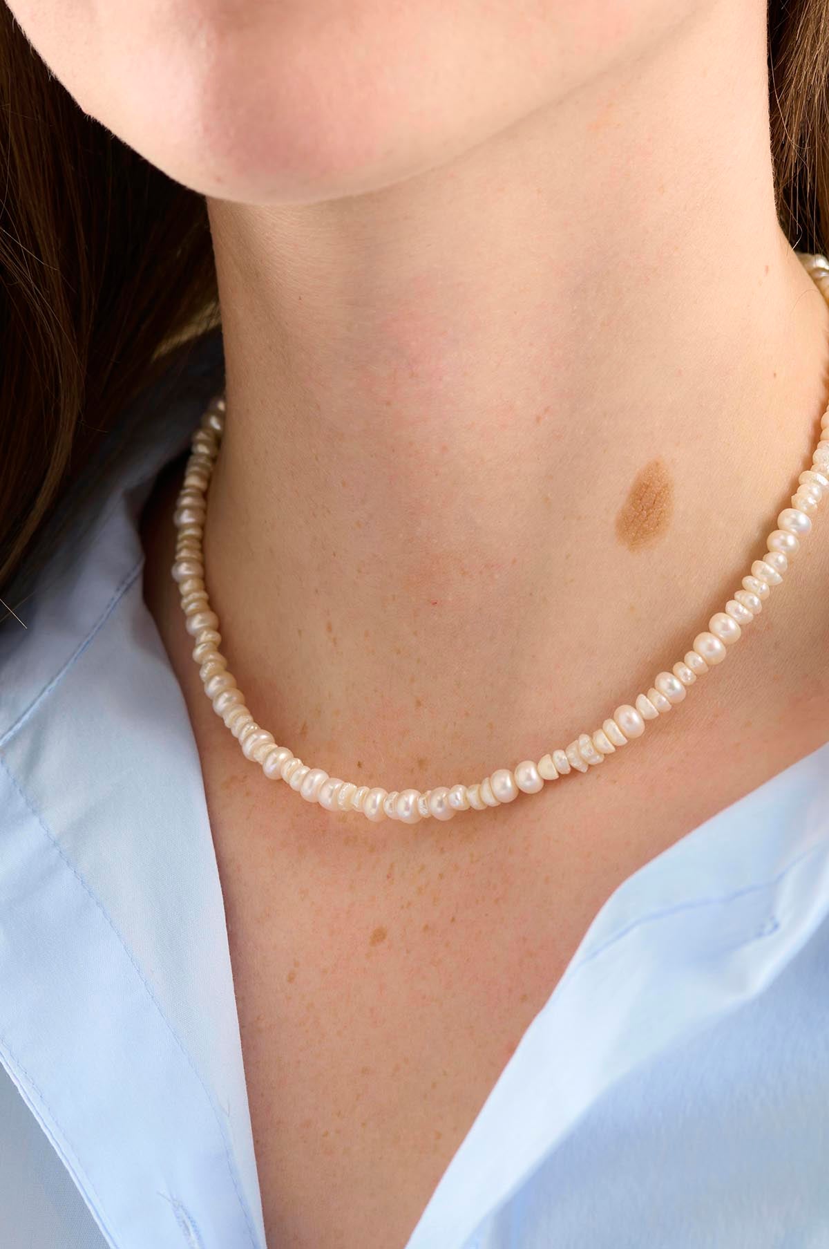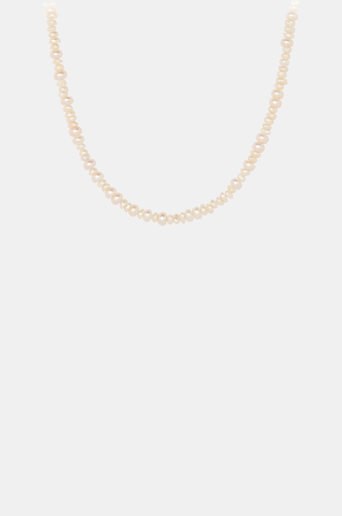 This super cool silver necklace features chunky irregular pearls all the way round for the ultimate beach look.