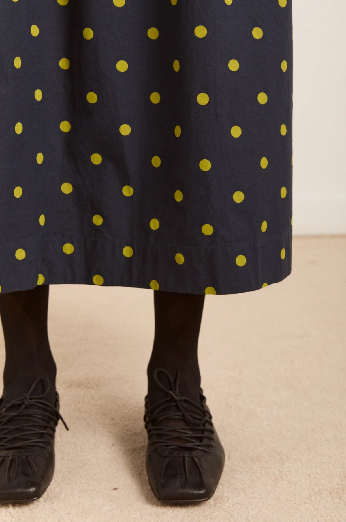 Heroing the polka dot, this navy midi dress is adorned with an olive spot pattern. Designed with a square neck and hand smocked bodice and sleeves for a flattering fit. Perfect for effortless everyday dressing.
